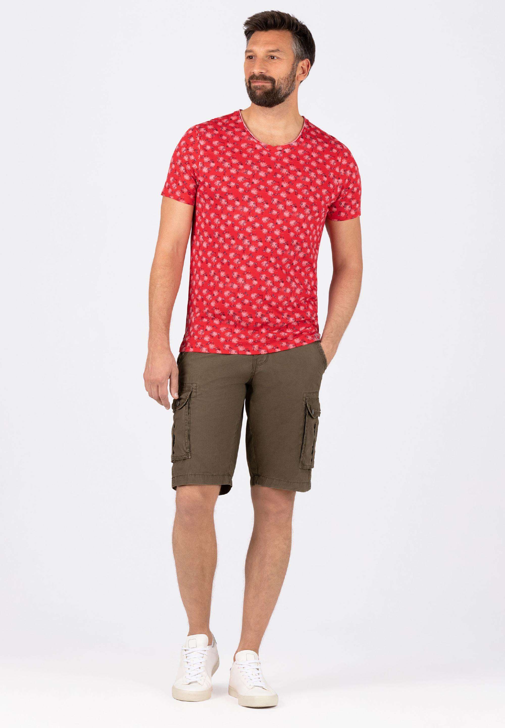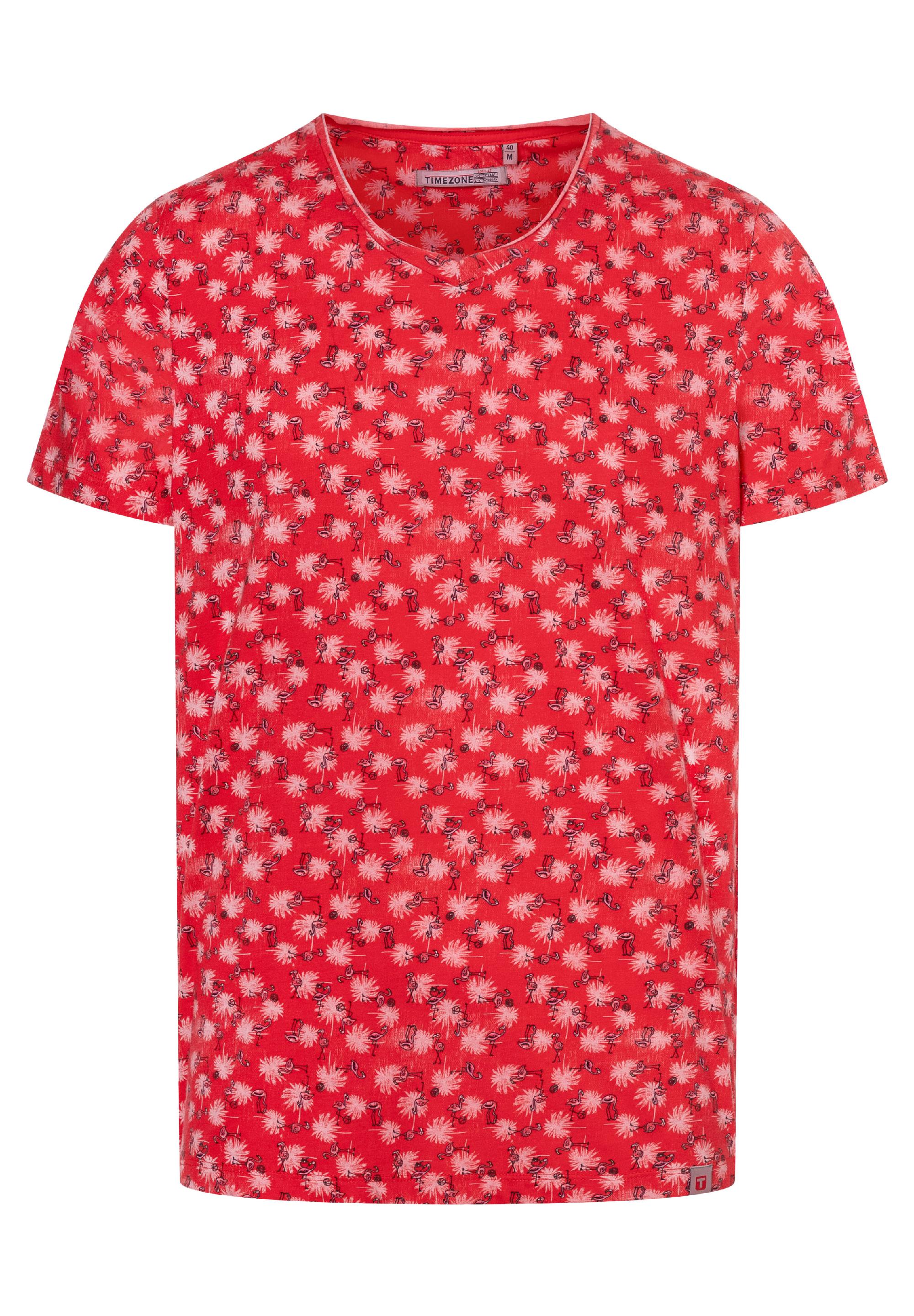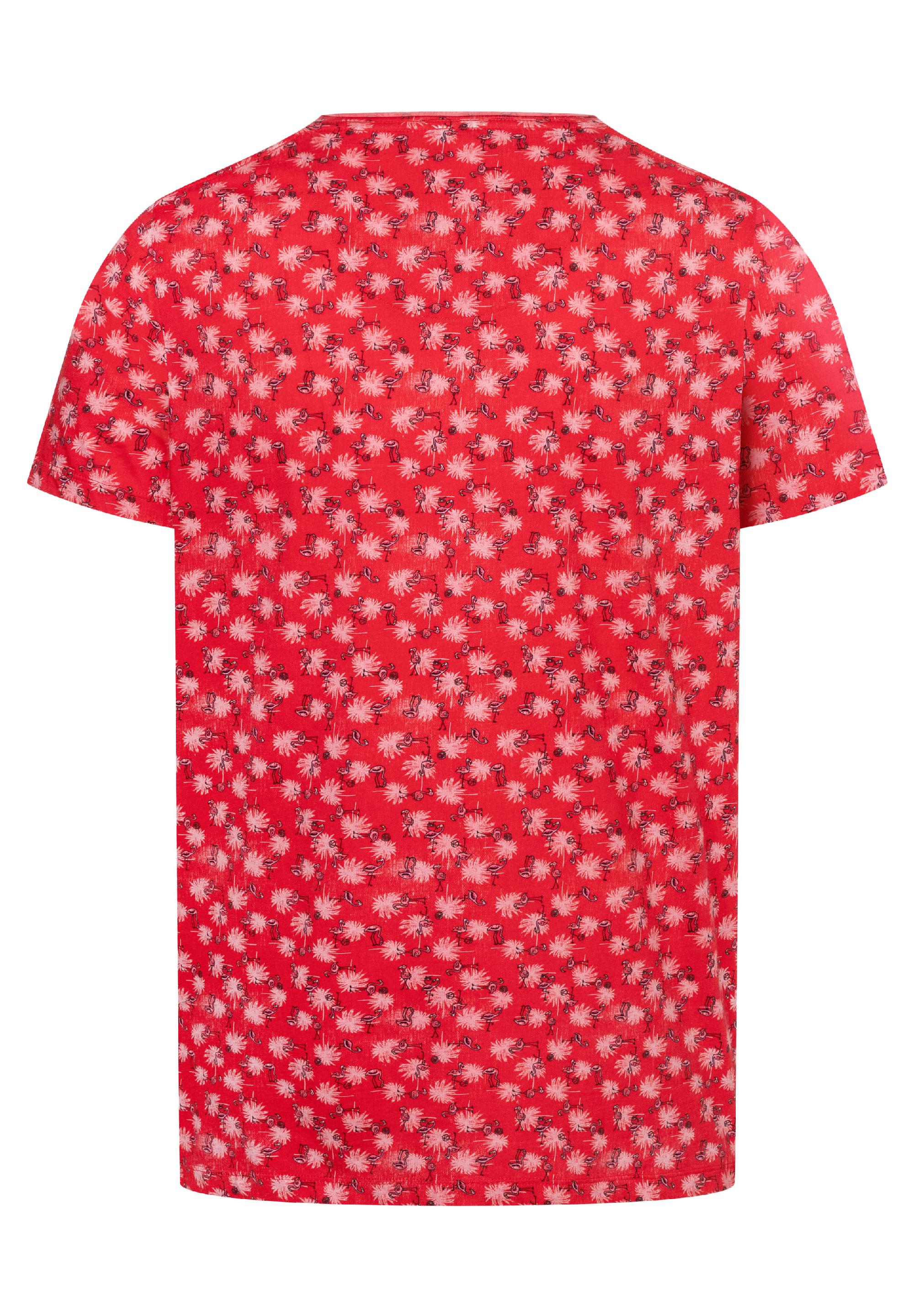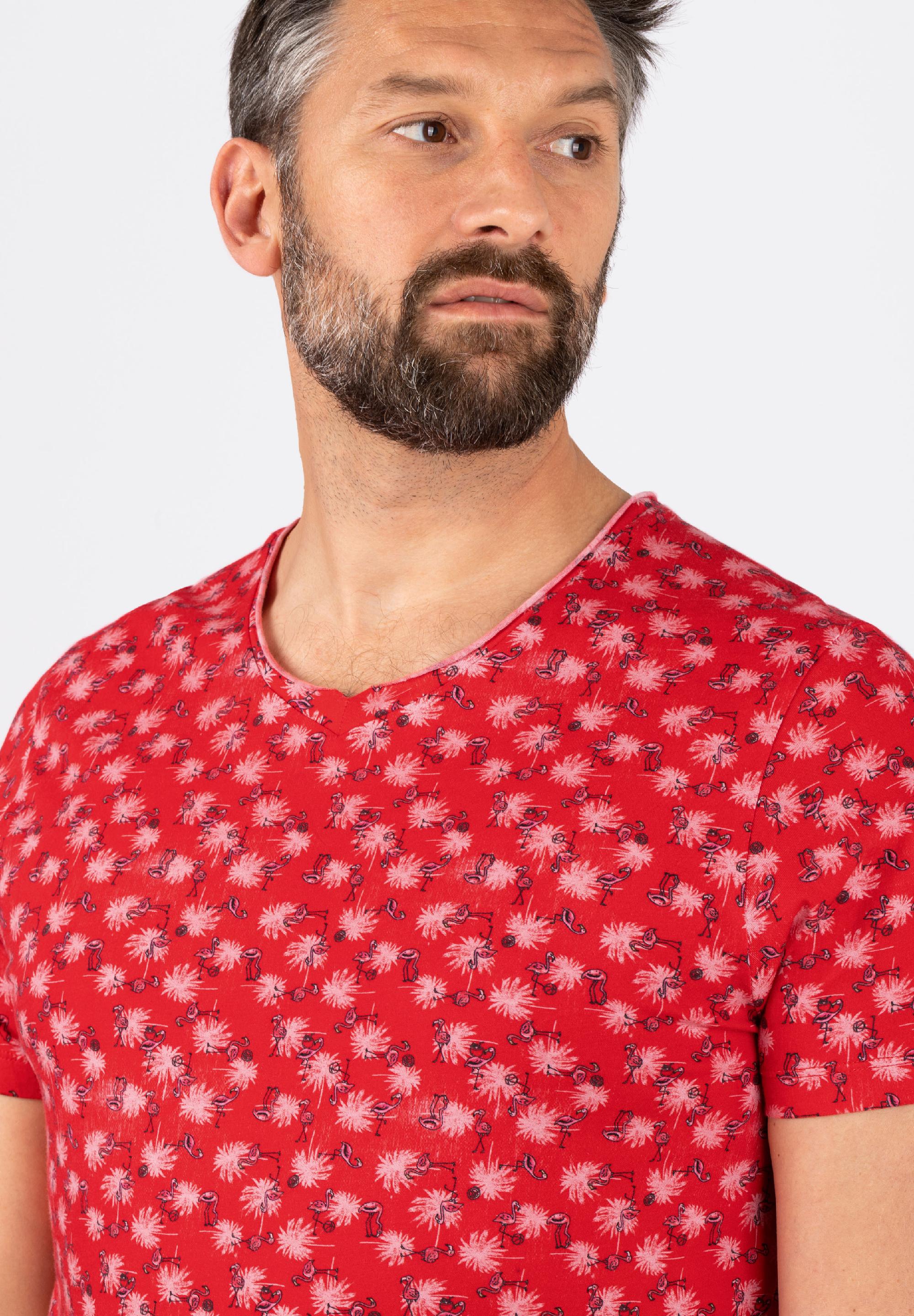Der Schnitt: clean, schlicht, bekannt, regulär mit kurzem V-Neck und geschnittener Rollkante. Der Allover-Print: prägnant, mit einem Twinkle in the eye-Effekt, mit Mini-Flamingos und Palmen. Ärmelabschluss und Saum sind klassisch mit einer Doppelnaht versehen, die Seitennähte lässig geschlitzt und das Rückenteil dezent verlängert. Die Qualität: eine softe Single Jersey-Qualität aus reiner, hochwertiger Baumwolle. Styling-Tipp: braucht unbedingt unifarbene Unterteile als Outfit-Partner.