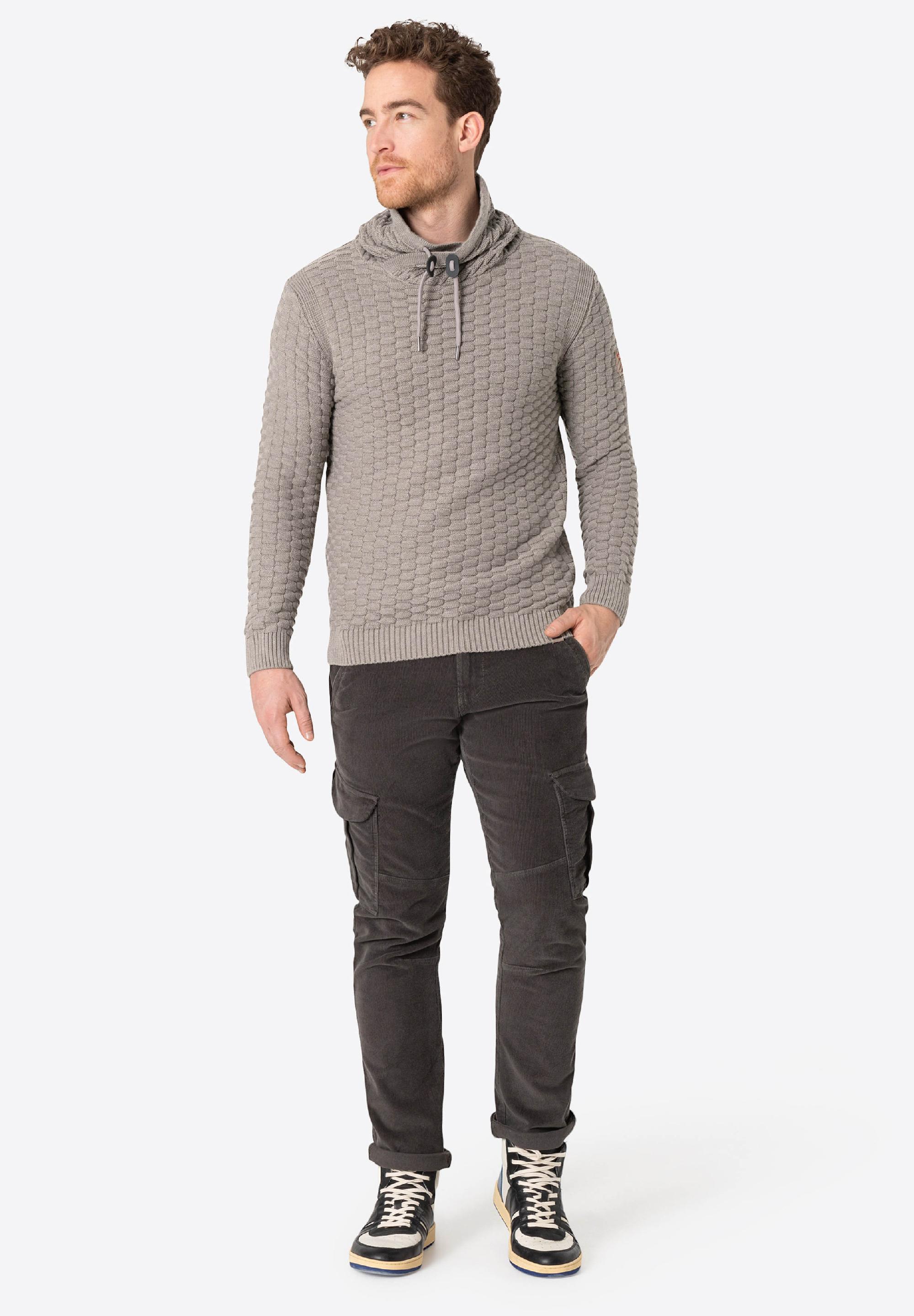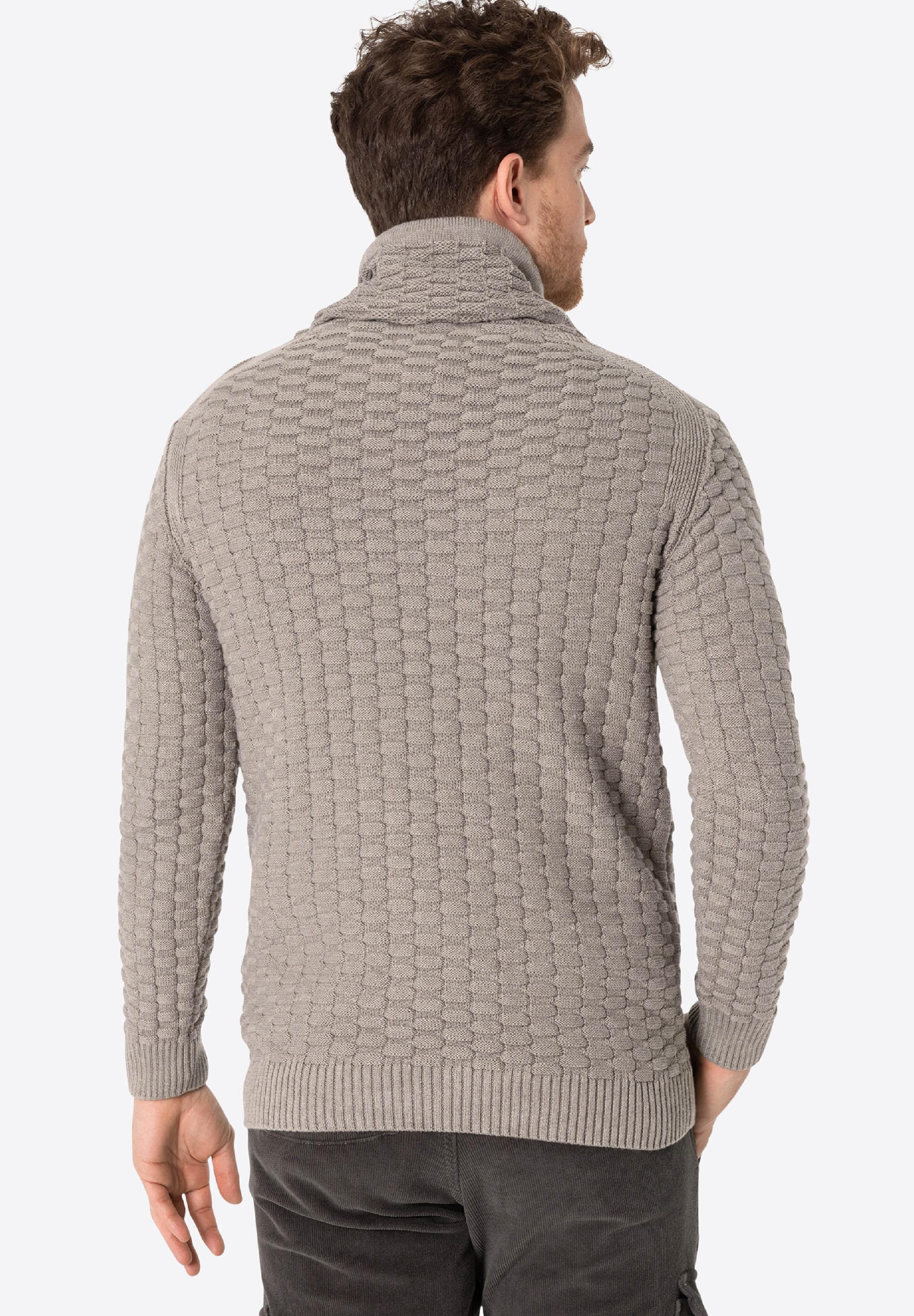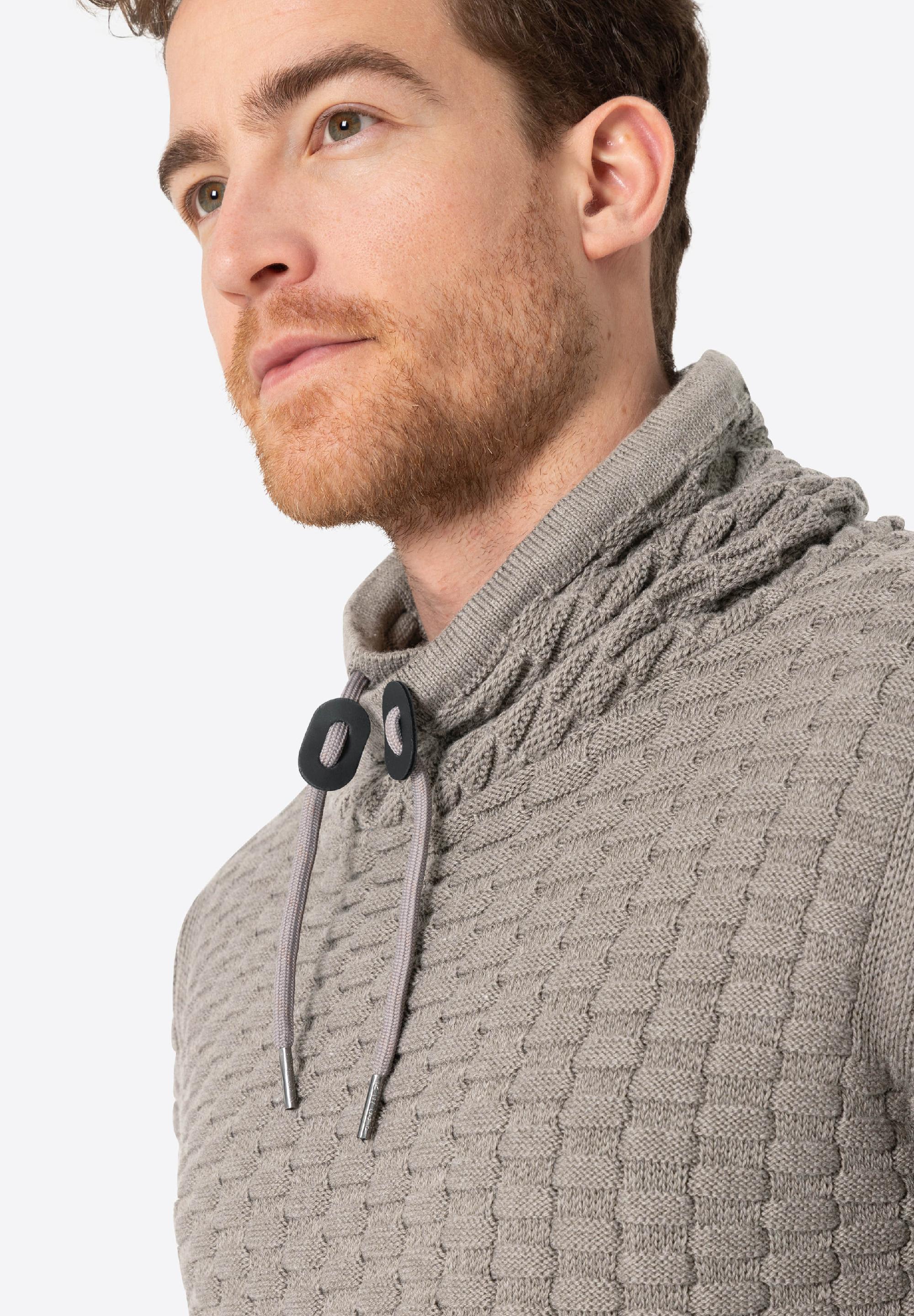 Für Modefreunde: Der lässige Chunky-Knit-Pullover aus einem Baumwoll-Polyacryl-Mix ist irgendwo zwischen Hoodie und Rollkragenpullover angesiedelt. Seinen coolen Look verdankt er zum einen dem hohen Kragen mit überlappender Front und zum anderen dem markanten 3D-Strickmuster in Schachbrettmuster-Optik. Das Modell hat klassische Rippbündchen an Ärmeln und Saum und eine französische Schulterverarbeitung. Hier liegt die Schulternaht nicht am höchsten Punkt, sondern ist lässig nach hinten versetzt.