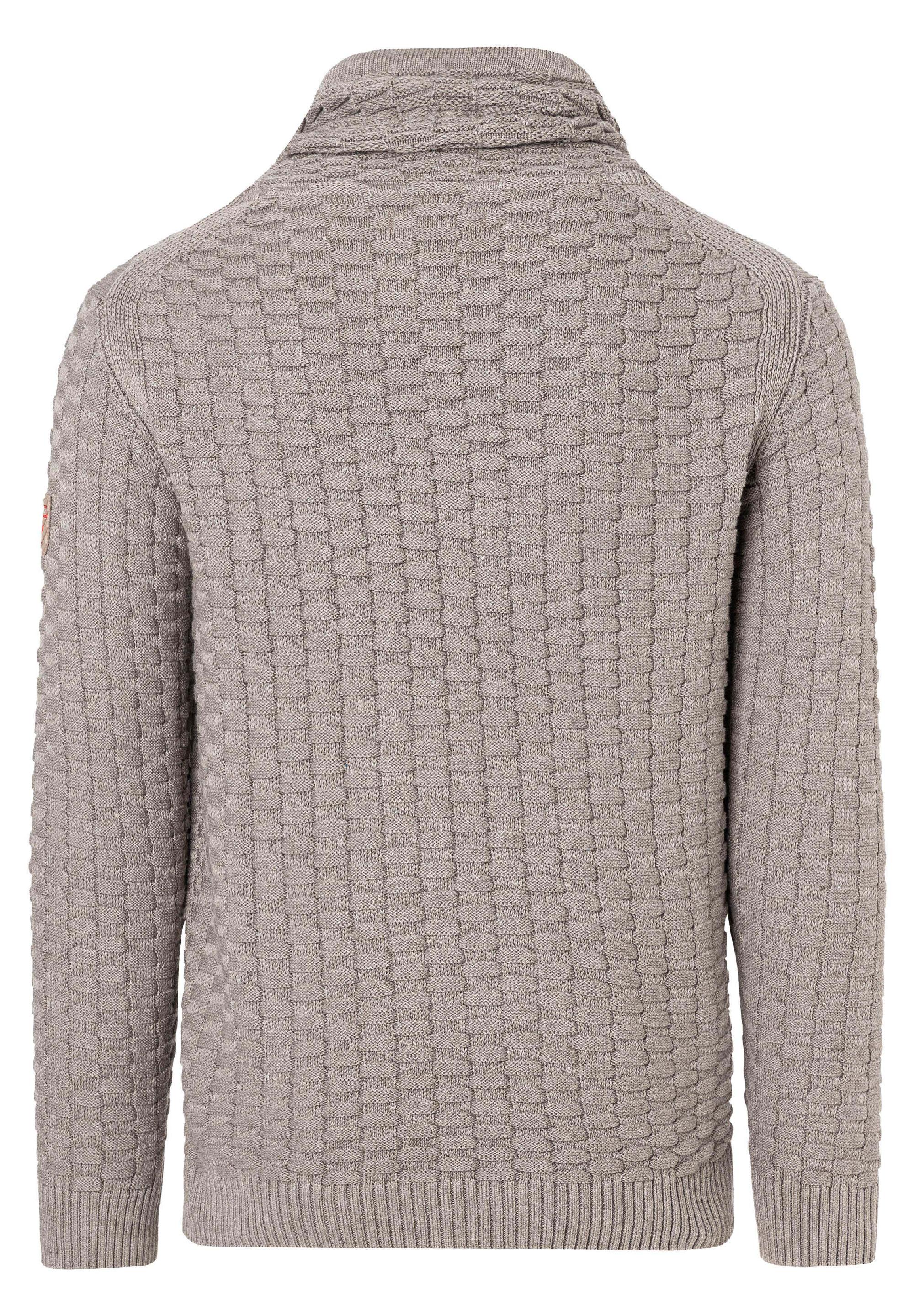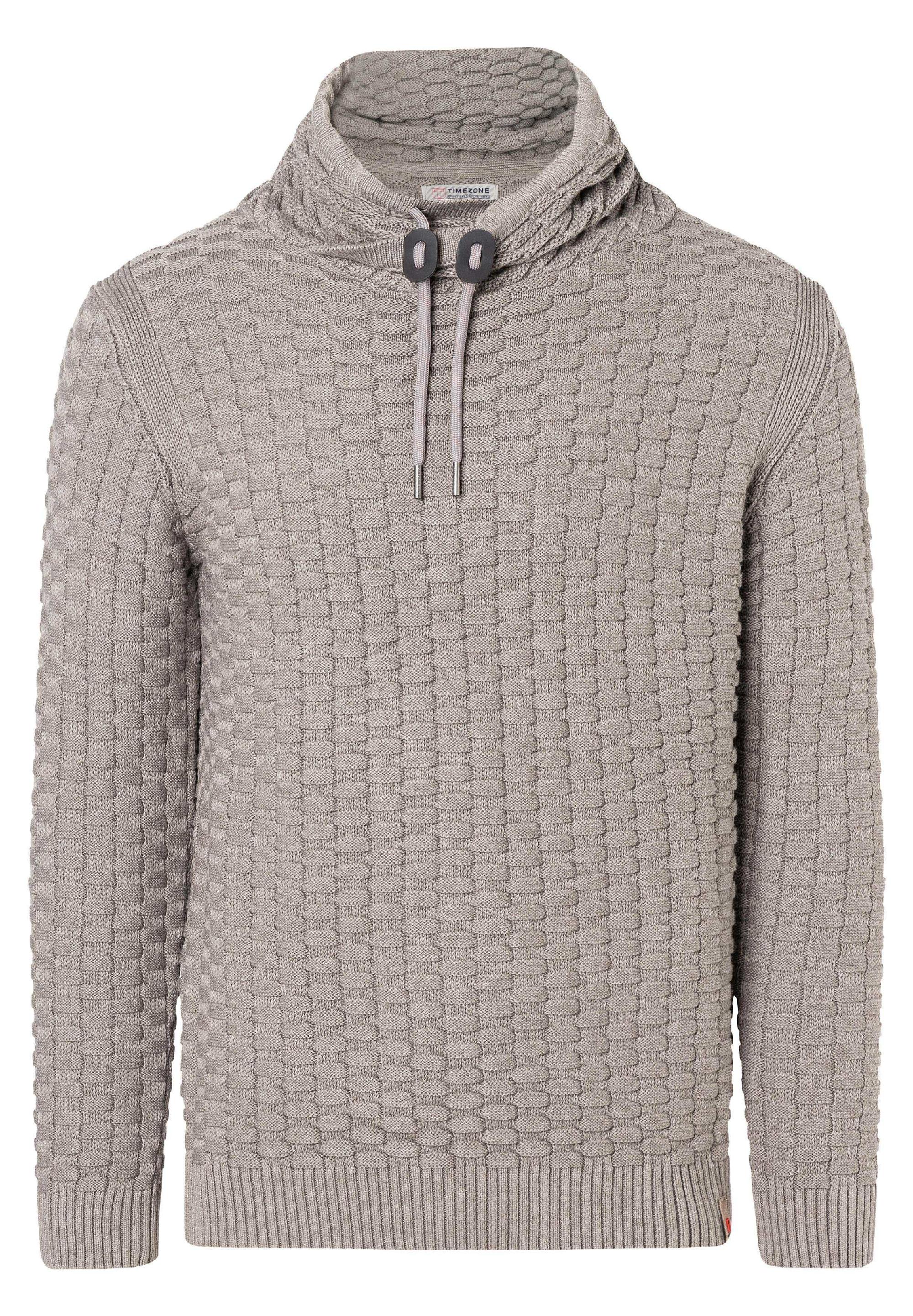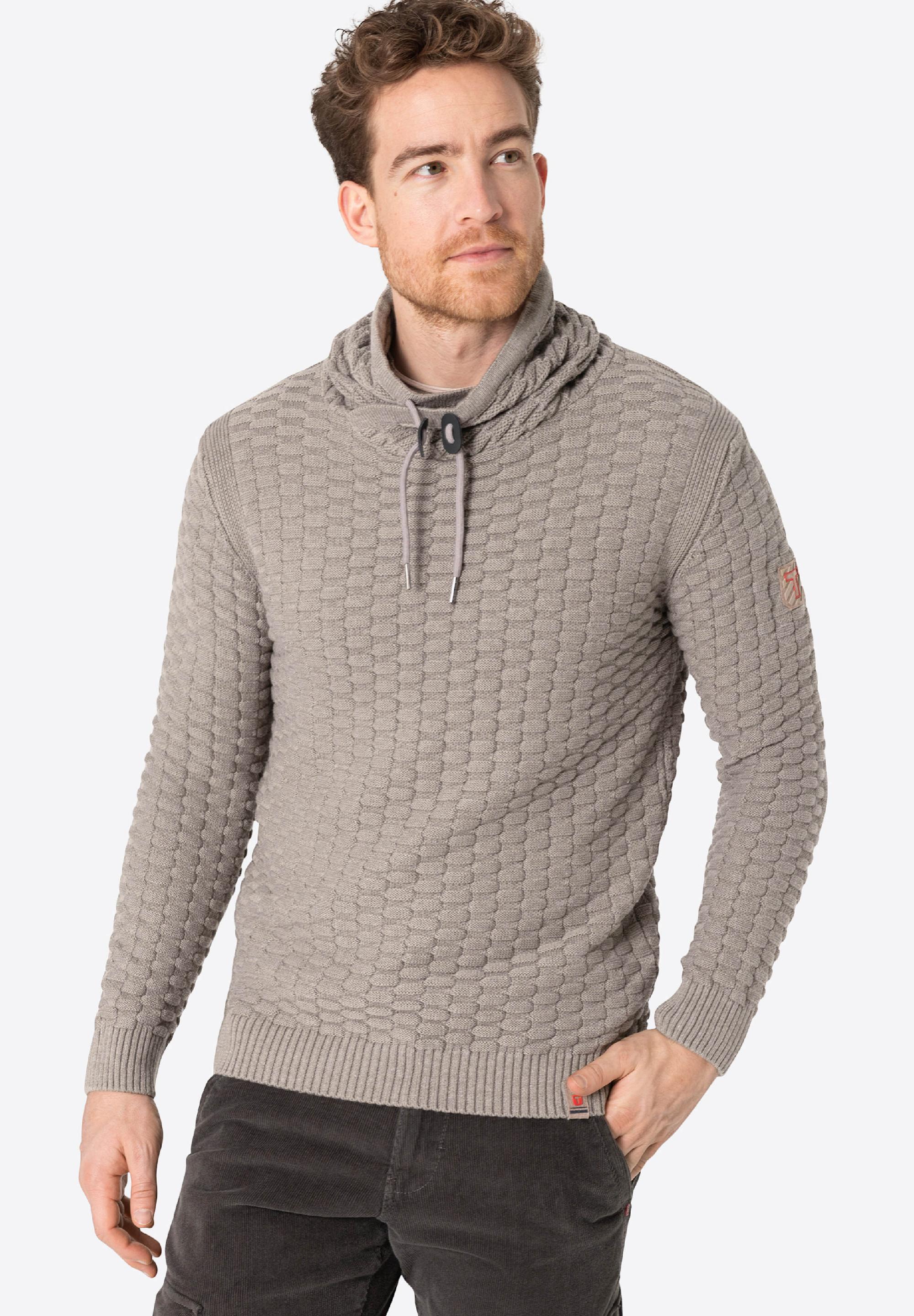 Für Modefreunde: Der lässige Chunky-Knit-Pullover aus einem Baumwoll-Polyacryl-Mix ist irgendwo zwischen Hoodie und Rollkragenpullover angesiedelt. Seinen coolen Look verdankt er zum einen dem hohen Kragen mit überlappender Front und zum anderen dem markanten 3D-Strickmuster in Schachbrettmuster-Optik. Das Modell hat klassische Rippbündchen an Ärmeln und Saum und eine französische Schulterverarbeitung. Hier liegt die Schulternaht nicht am höchsten Punkt, sondern ist lässig nach hinten versetzt.