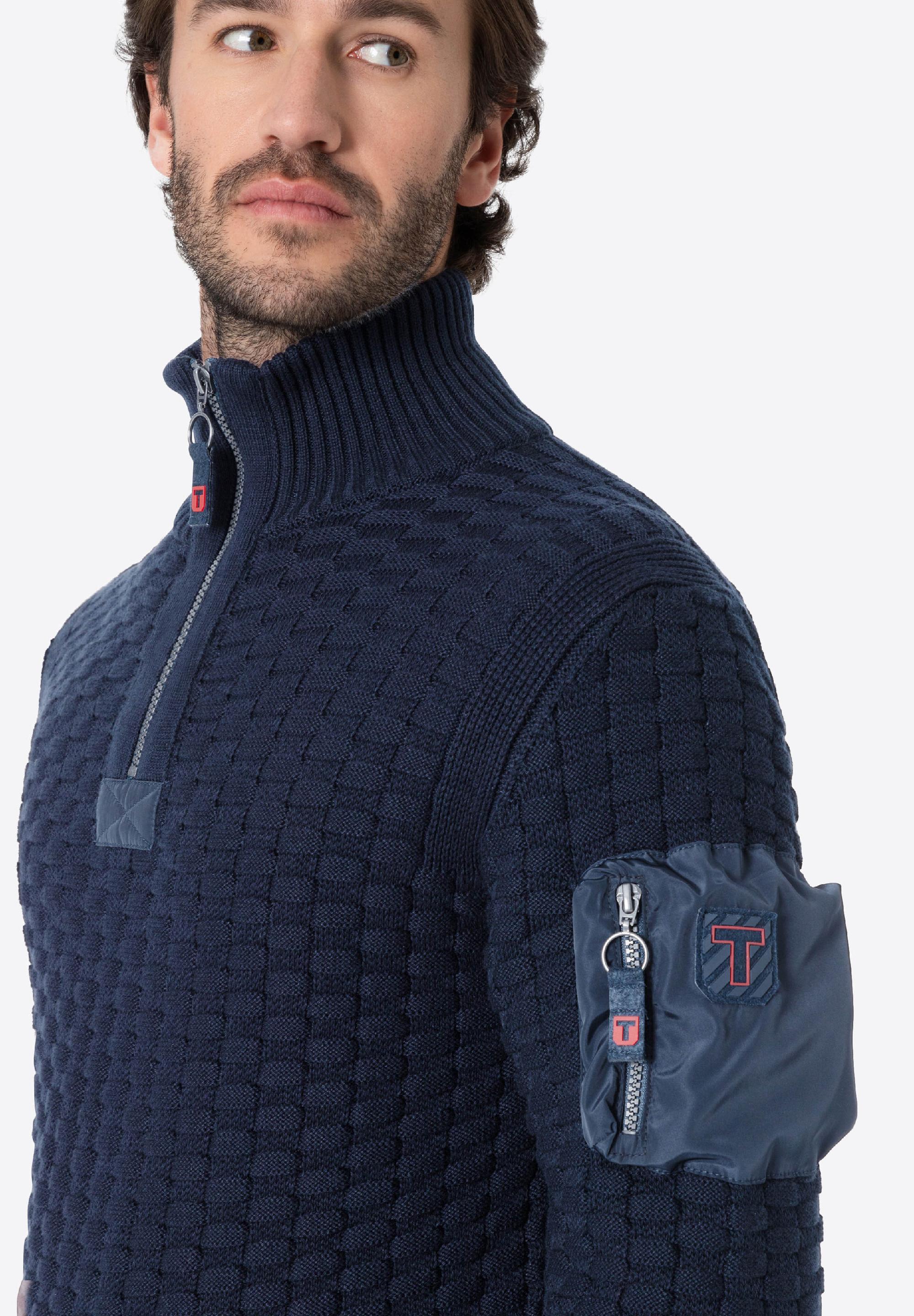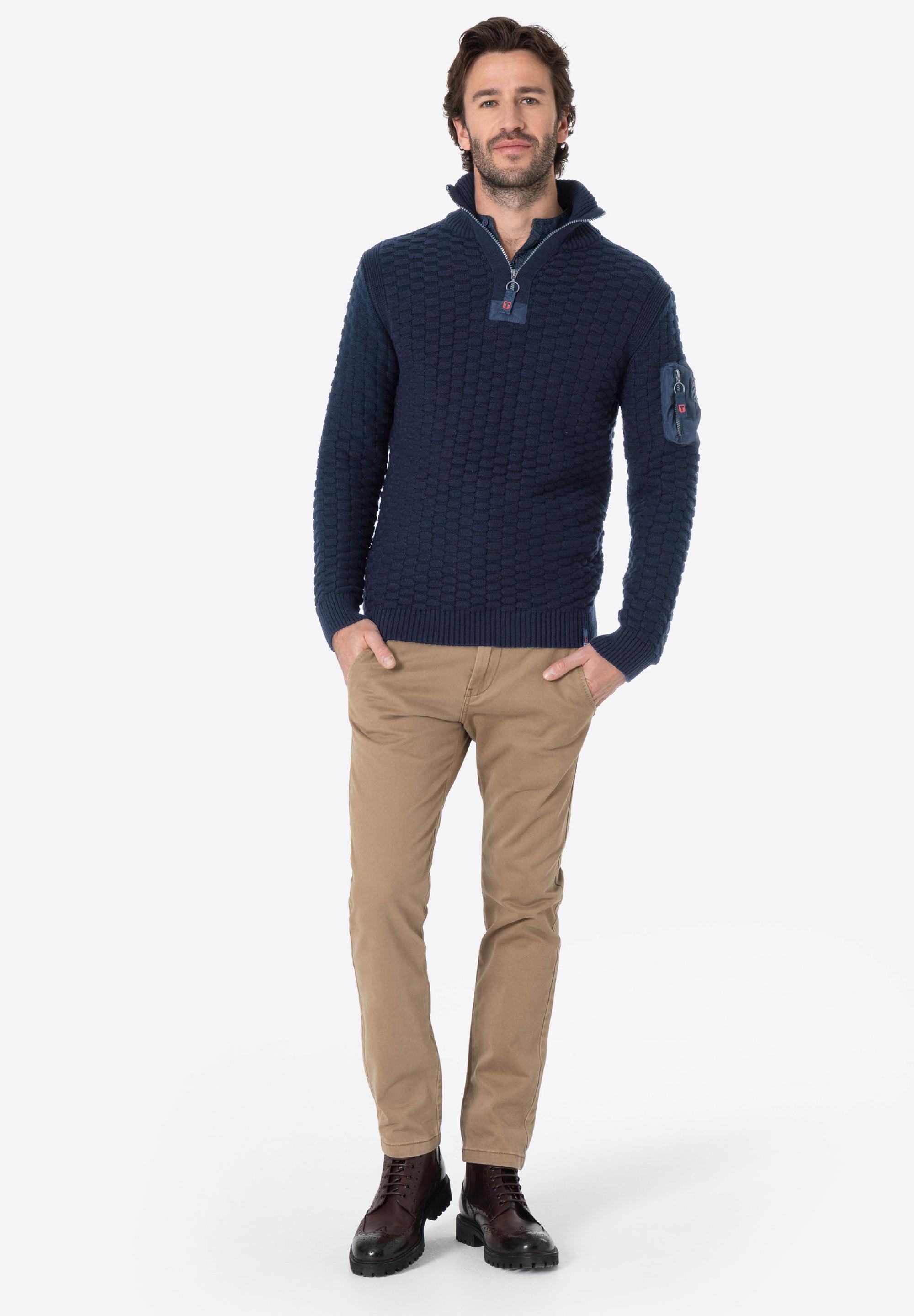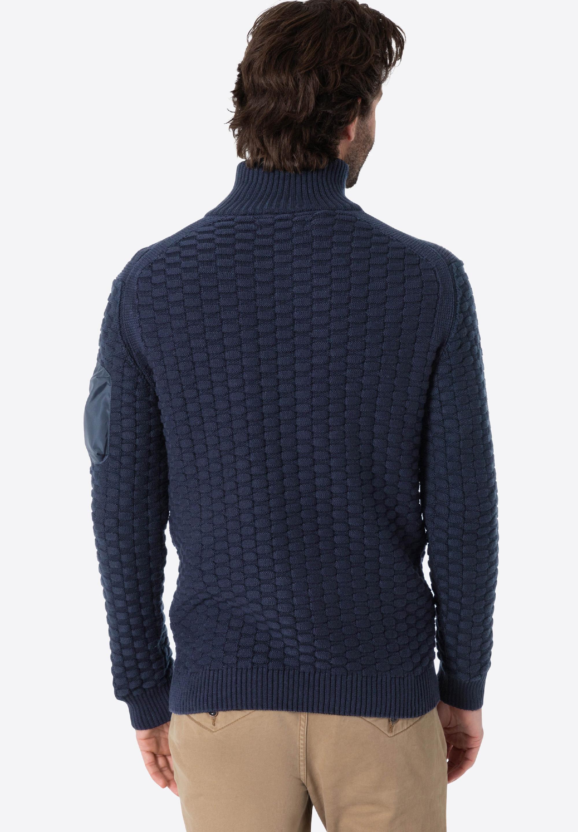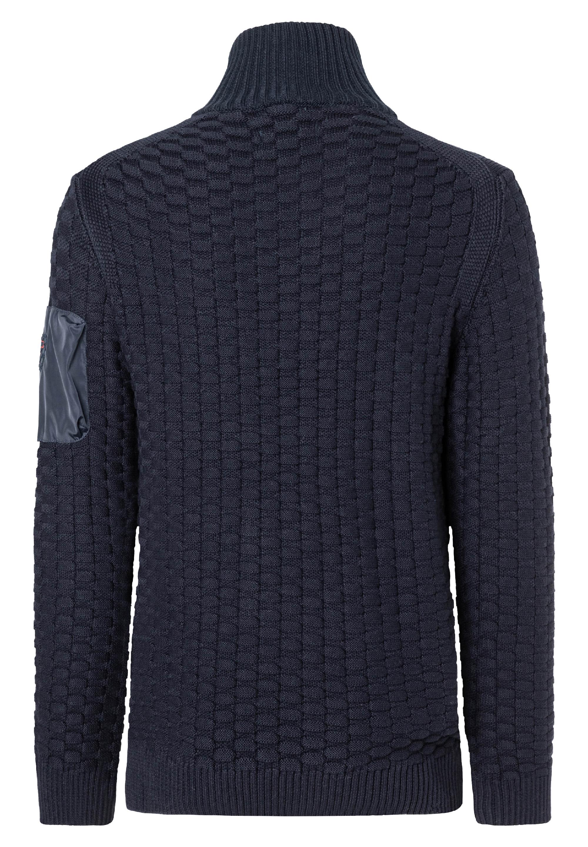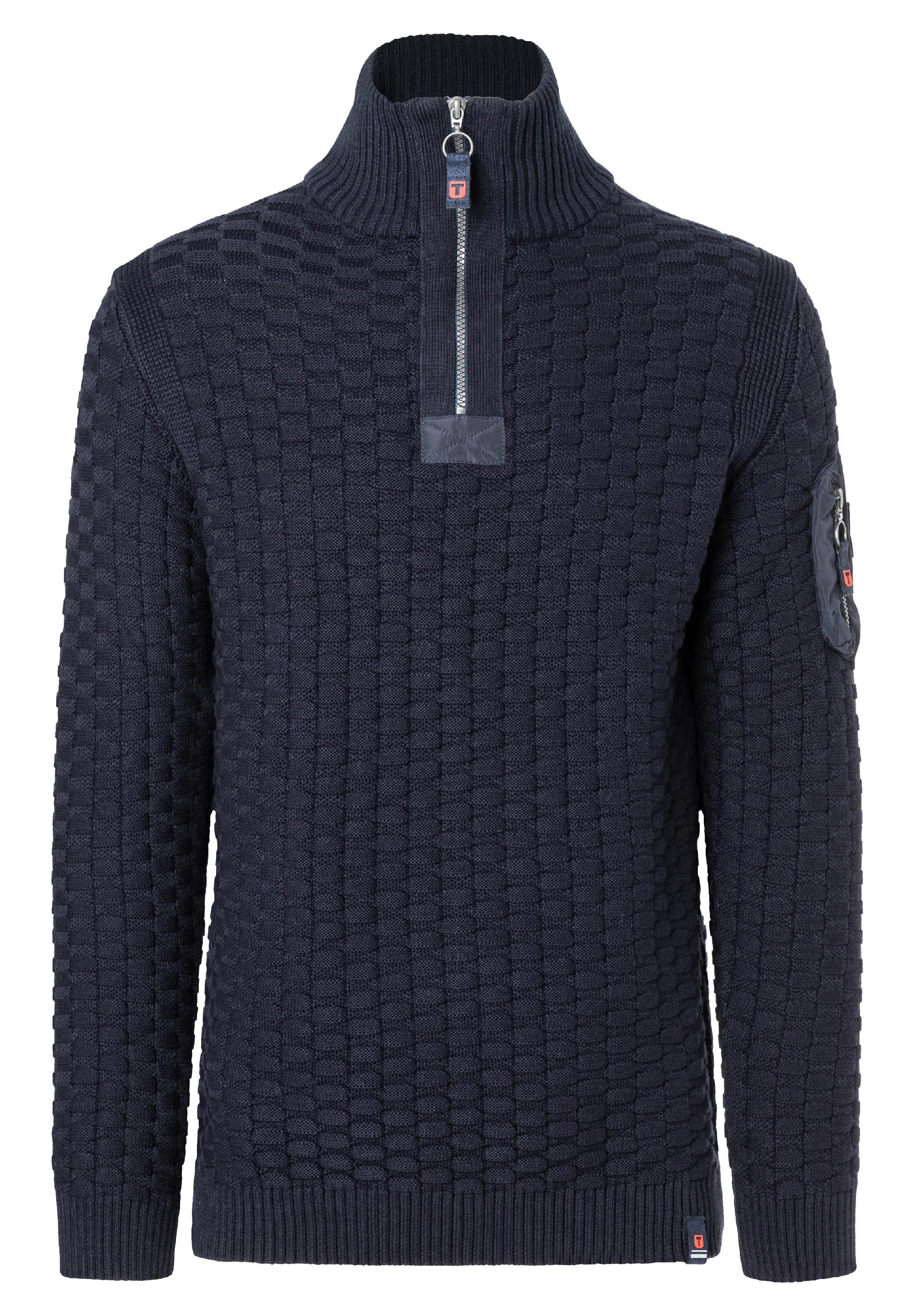 Kernig, wie für Seefahrer gemacht: der robuste Strick-Troyer aus hochwertigem Baumwoll-Polyacryl-Mix. Das Modell hat ein markantes Schachbrett-Strickmuster in 3D-Optik, einen hohen Ripp-Turtleneck-Kragen mit halbem Reißverschluss, klassisch gerippte Ärmel- und Saumbündchen und eine französische Schulterverarbeitung. Hier liegt die Schulternaht nicht am höchsten Punkt, sondern ist lässig nach hinten versetzt. Material-Mix: Die Ärmeltasche mit Reißverschluss ist aus glatt gewebtem Polyester.
