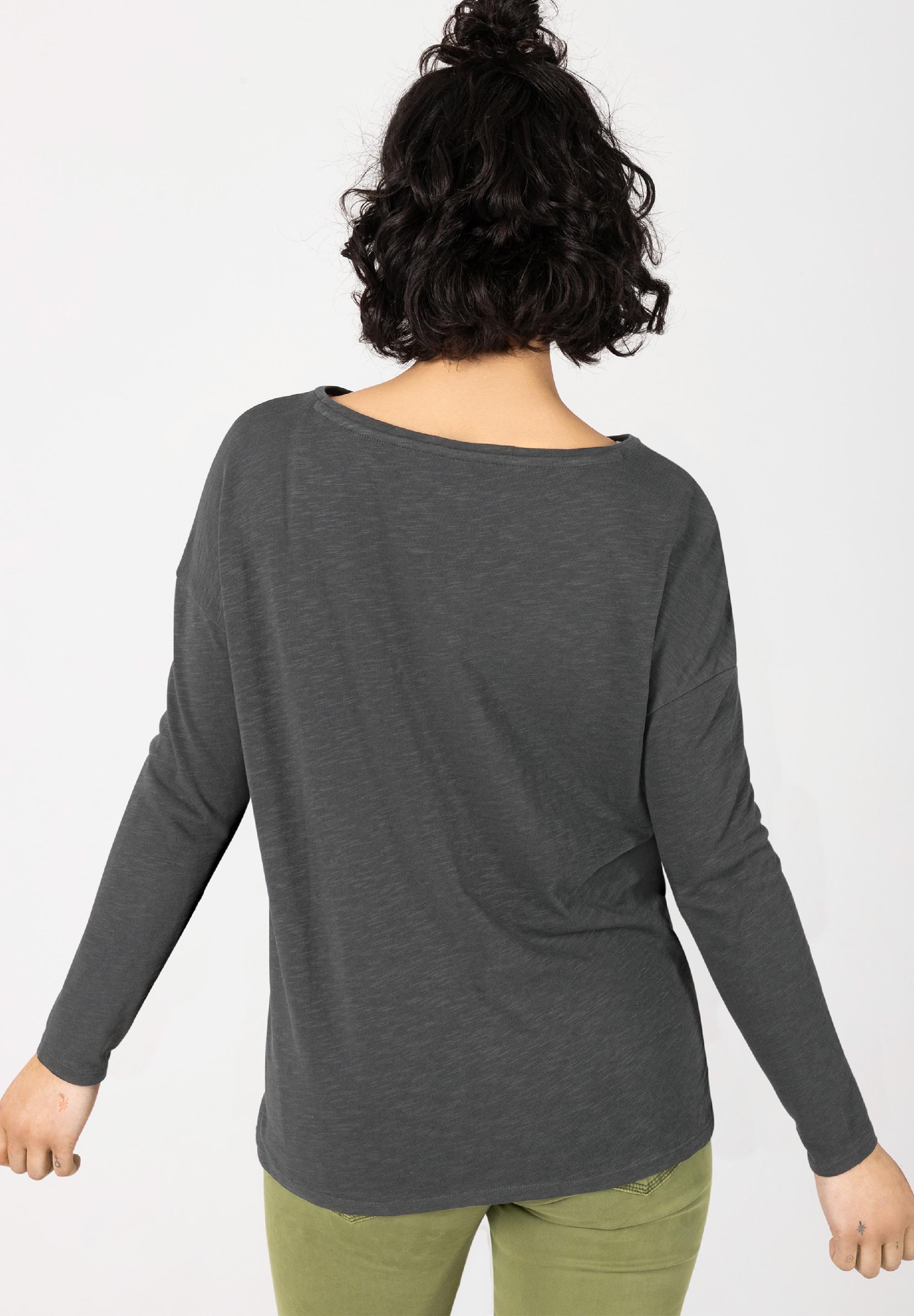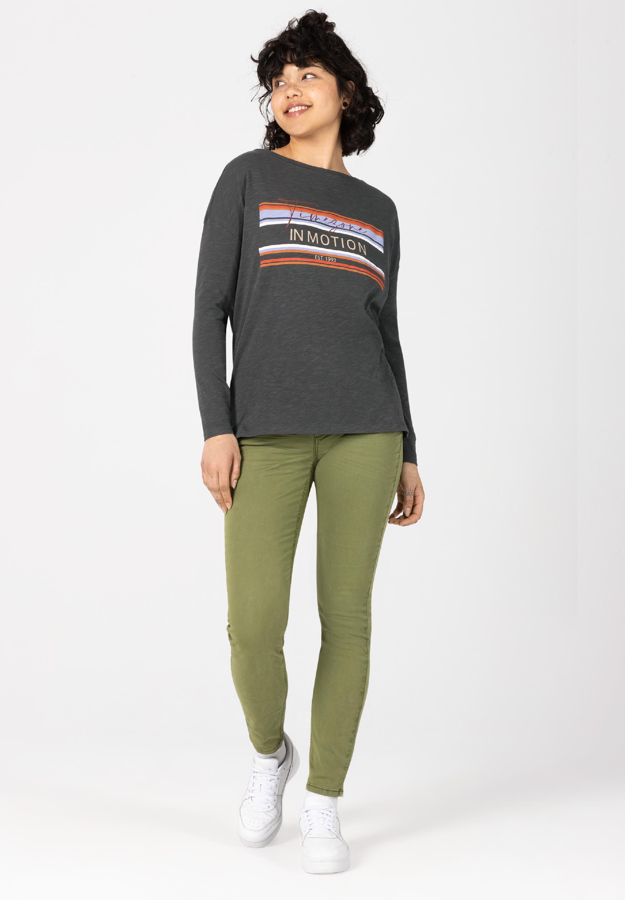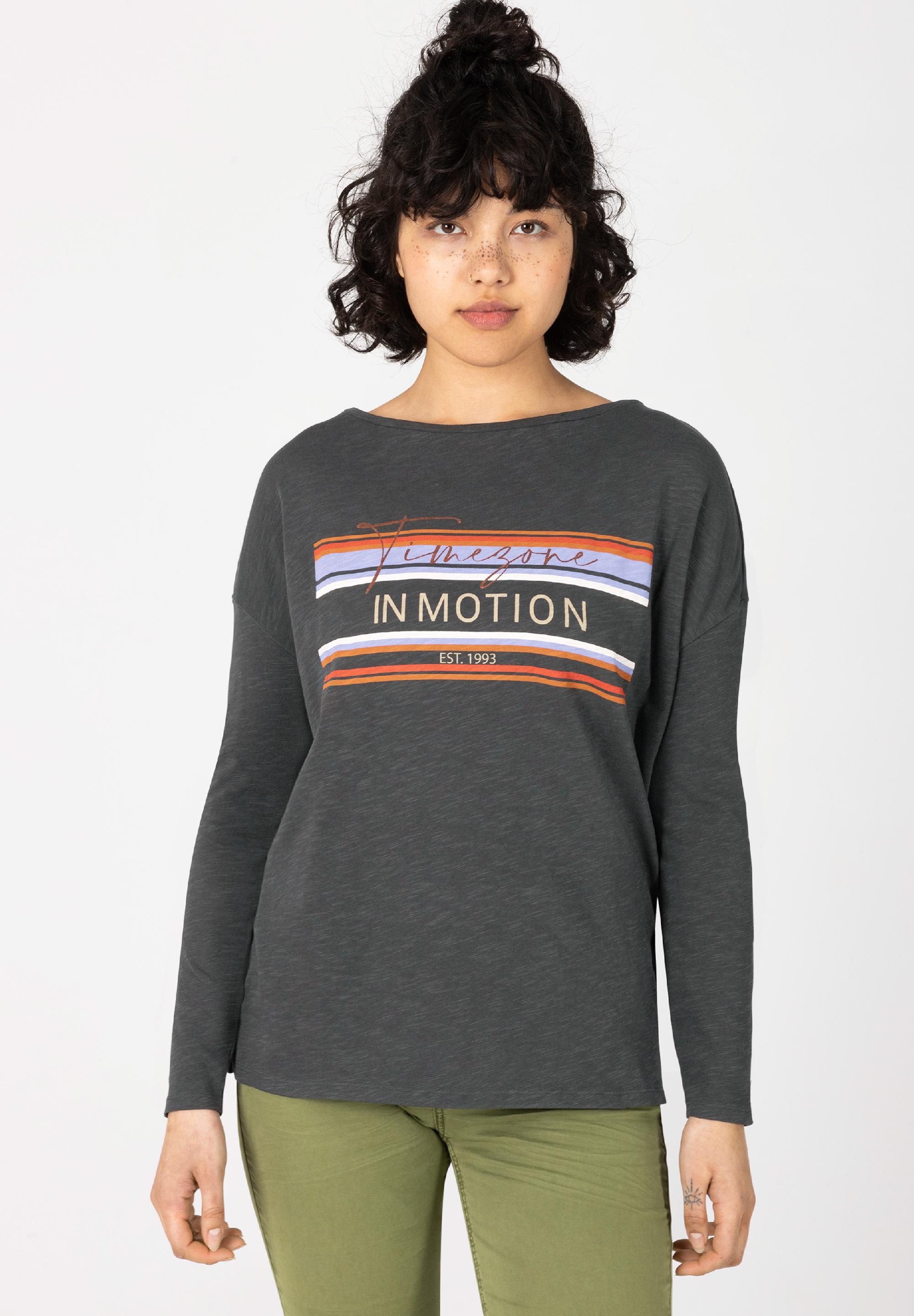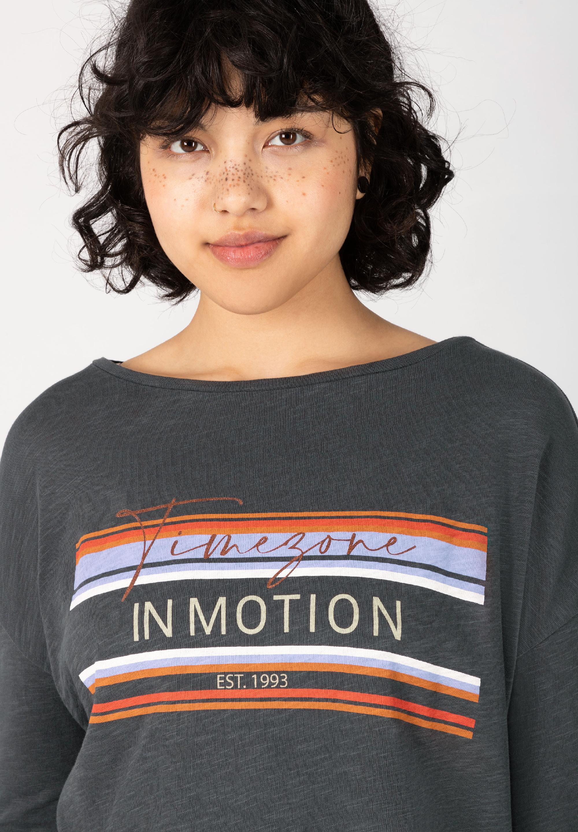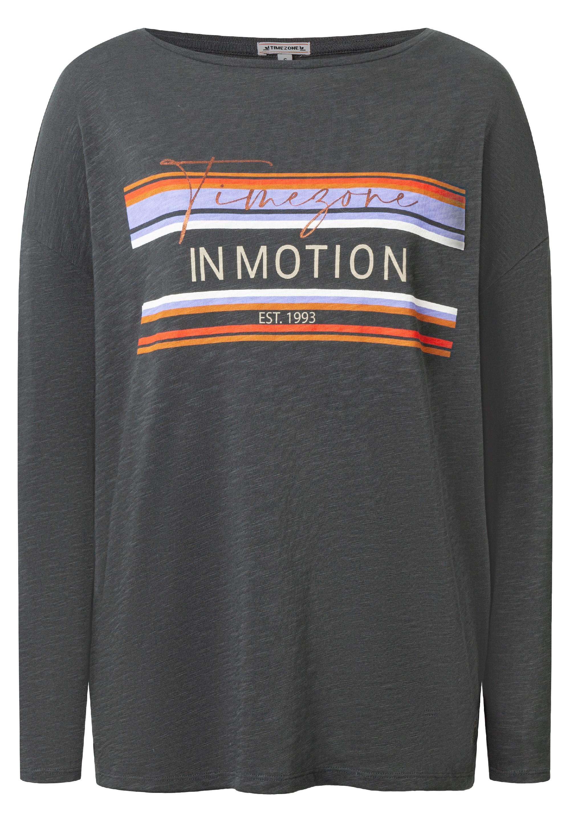 Immer in Bewegung bleiben. TIMEZONE in Motion. Lässiges Longsleeve aus hochwertigem, reinem Baumwoll-Slub-Jersey mit ikonischem Statement-Print auf der Brust. Lockerer, weiter Schnitt mit ovalem Ausschnitt, stark überschnittenen Schultern und schmalen, langen Ärmeln. Gerader Saumverlauf mit seitlichen, kurzen Schlitzen. Egal, ob unter einen Blazer, Karohemd, oder zu High Waist Jeans, das coole Statement-Shirt lässt sich mit allem kombinieren.