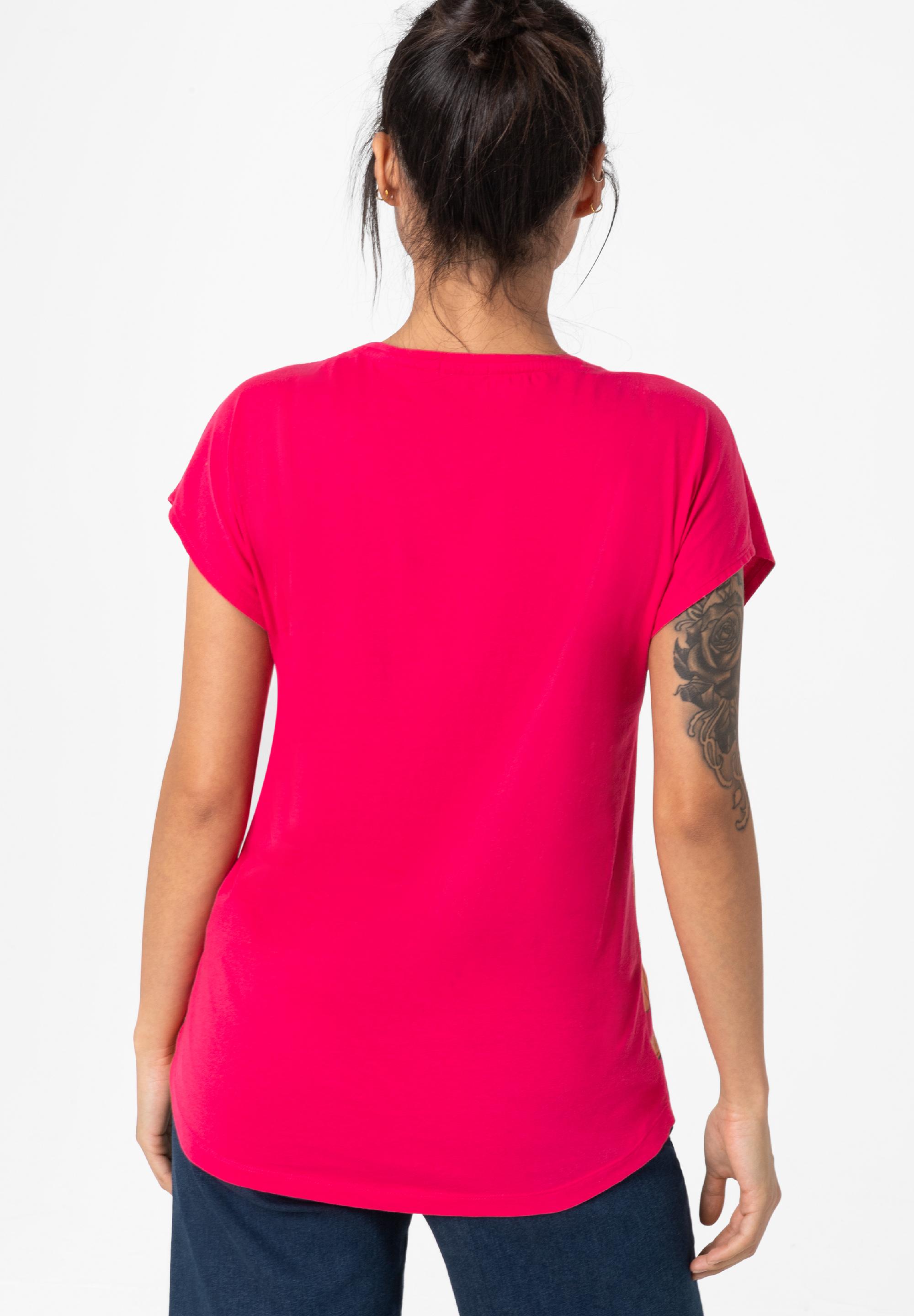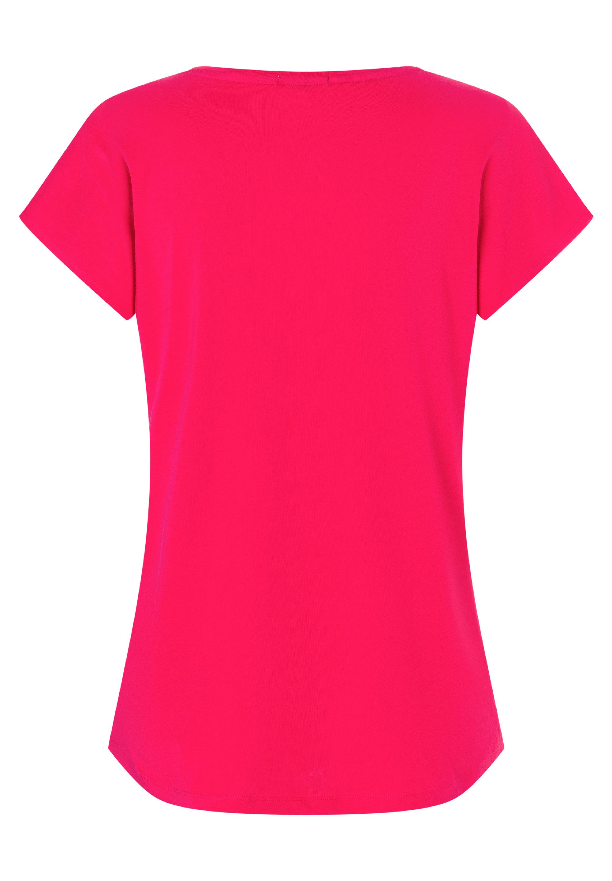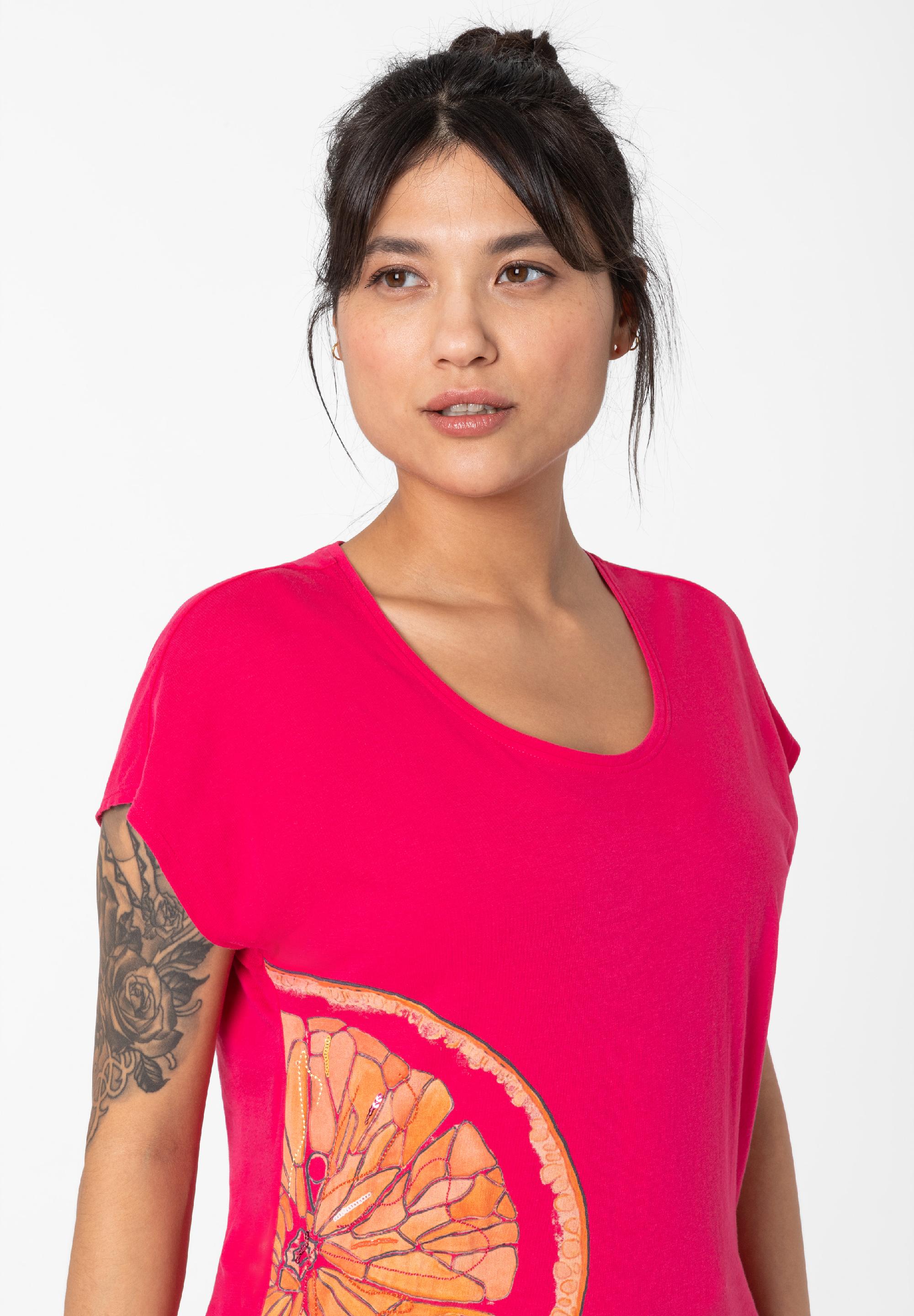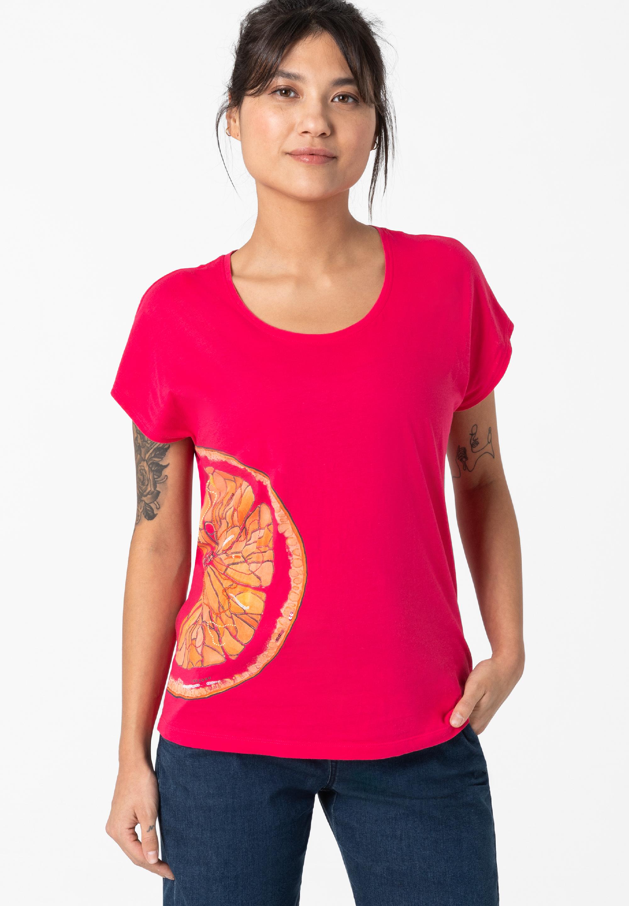 Absolut im Trend und ein echtes Wardrobe Essential: das T-Shirt mit Motiv-Charakter. Modell aus supersoftem, leichtem Baumwolle Single Jersey mit Rundhalsausschnitt, sehr kurzen, angeschnittenen Ärmeln und lässig verlängertem Rückenteil. Neu: die Druckplatzierung! Seitlich und angeschnitten: ein kontrastreicher, moderner und auffälliger Mix aus Print, Stickerei und glitzernden Mini-Pailletten. Der Schnitt: feminin, gerade. Beste Kombination? Mit cropped Jeans und den Lieblings-Sneakern.