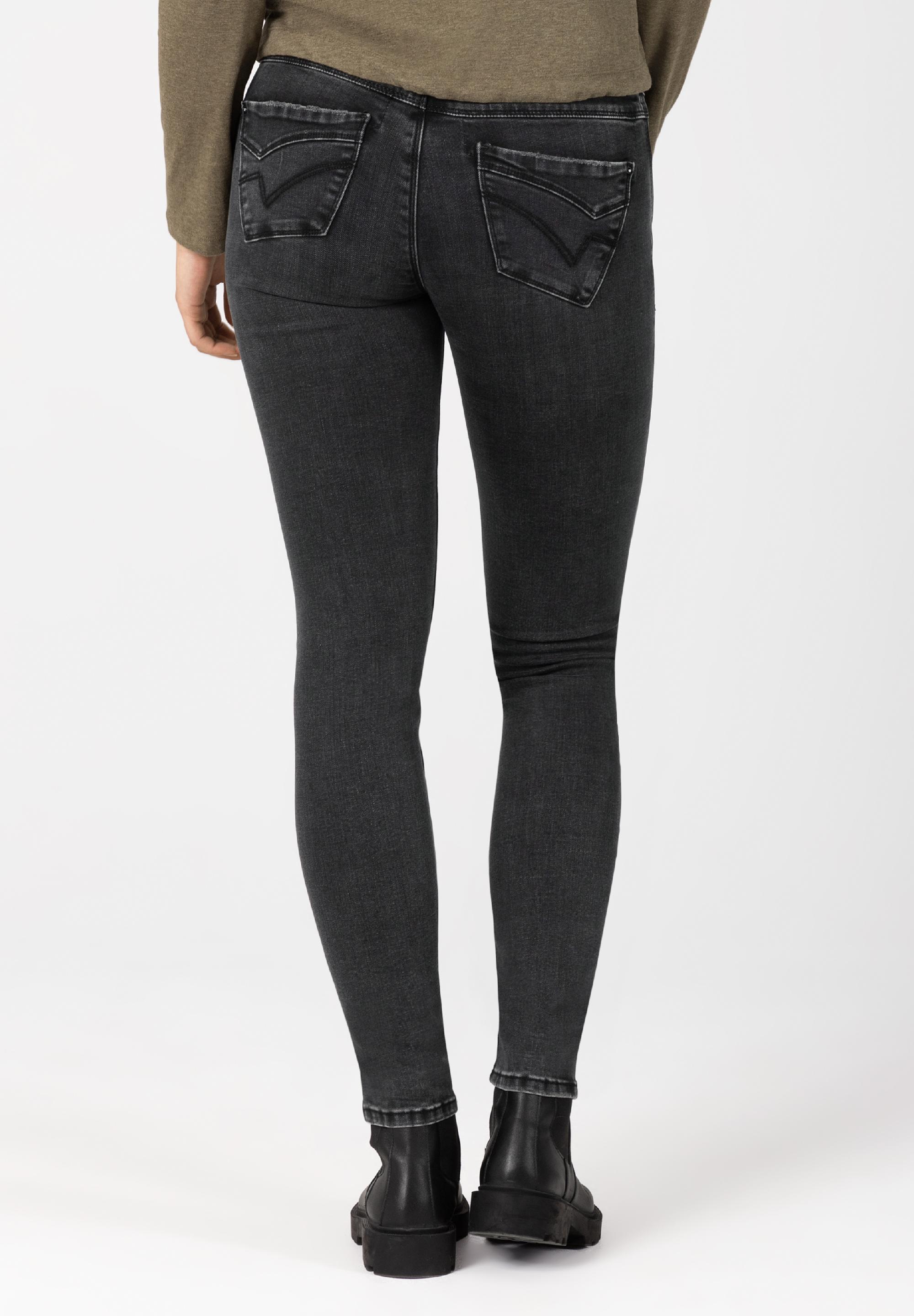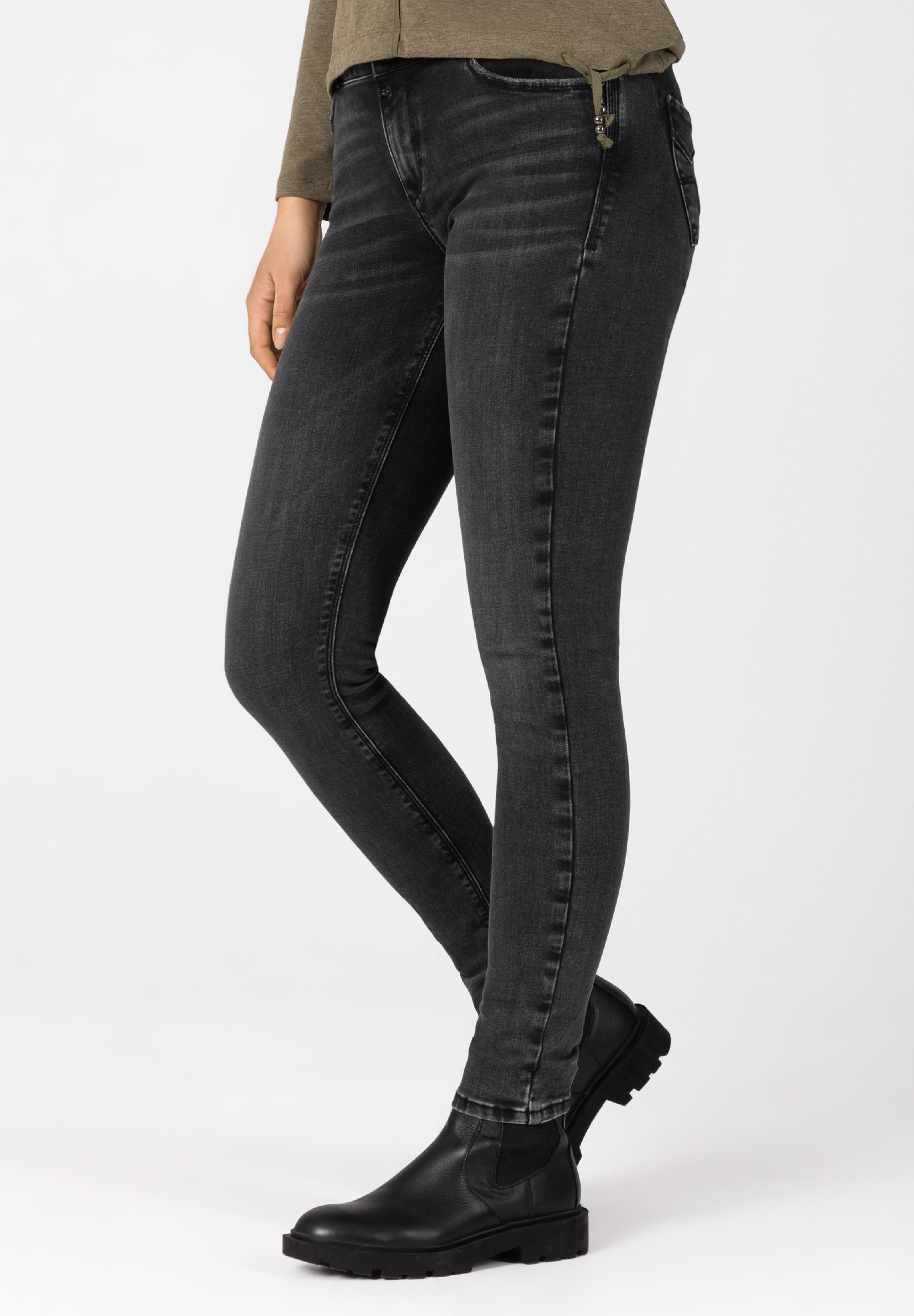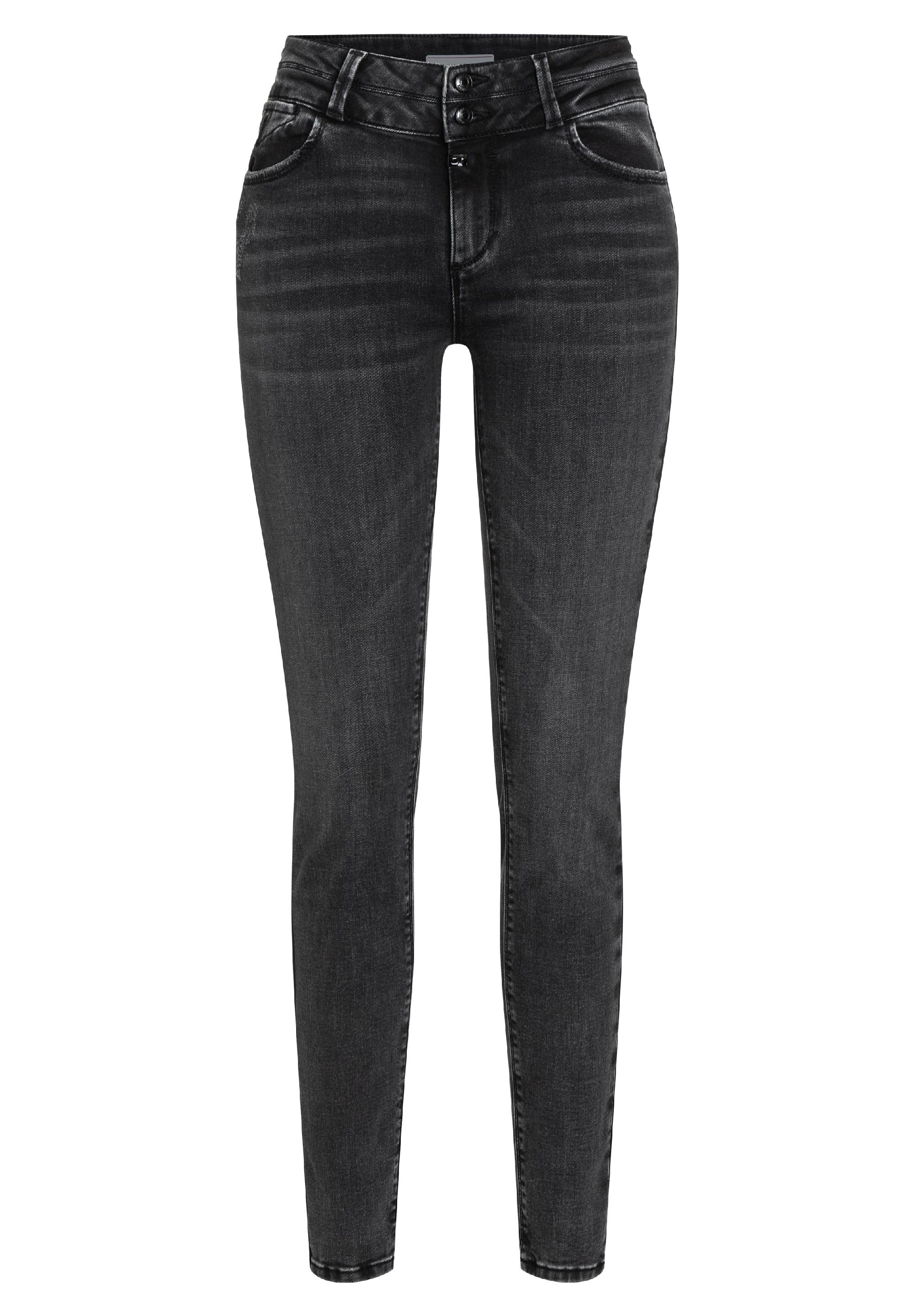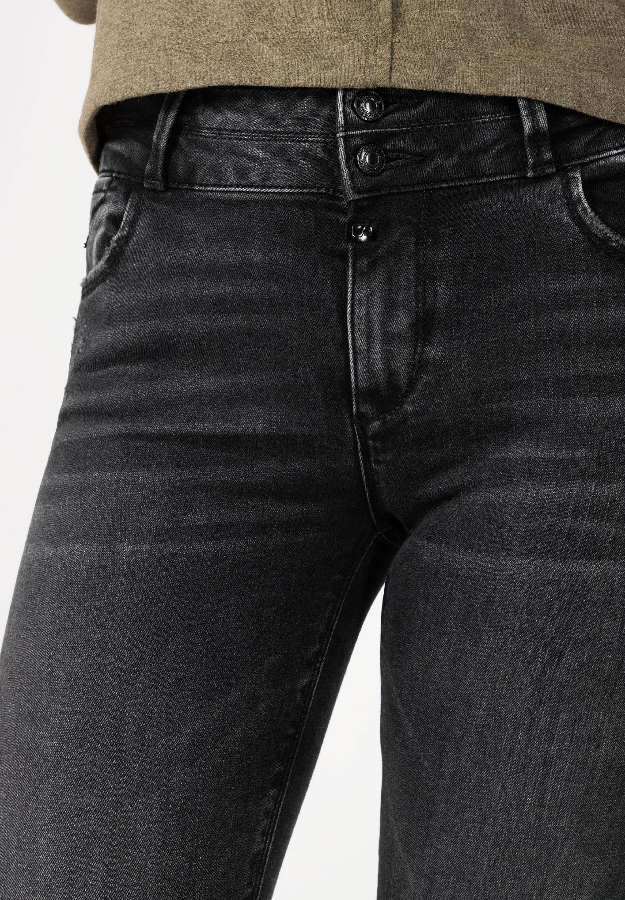Klassisch, zeitlos, wandelbar, ultra-modern und heiß geliebt: Die schwarze Slim Fit-Jeans. Damit das so bleibt und die Farbe länger hält wurde dieses Modell mit einer speziellen Technologie von ISKO™ ausgerüstet. Back to Black. Superlässige, markant designte Slim-Fit-Jeans aus einem hochwertigen, stretchigen Baumwolle-Polyester-Mix. Fashionistas setzen bei ihrer Rock-Star-Black-Wash-Jeans auf einen breiten Split-Bund mit zwei Knöpfen und prägnante Gesäßtaschen, die den Po perfekt modellieren.