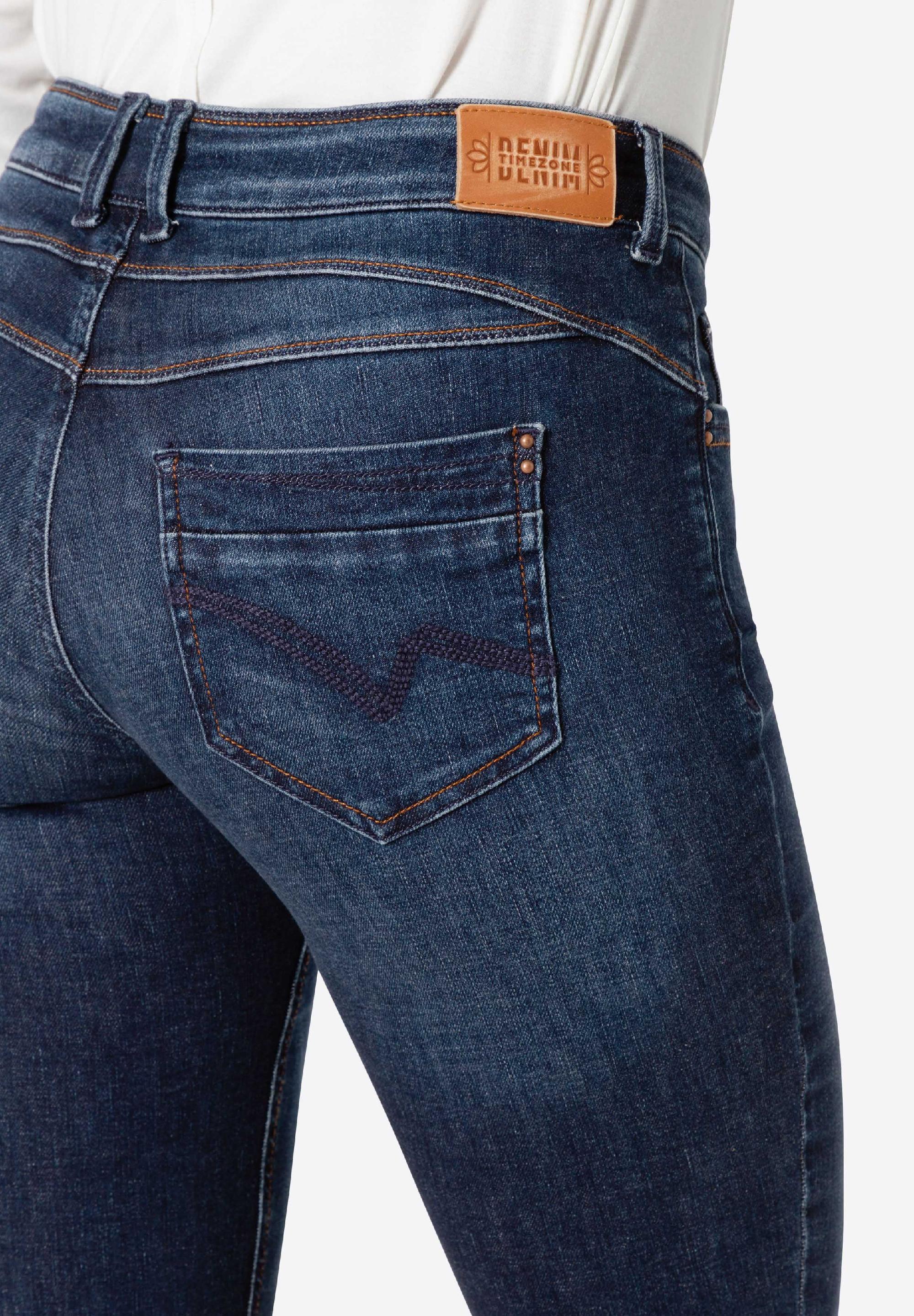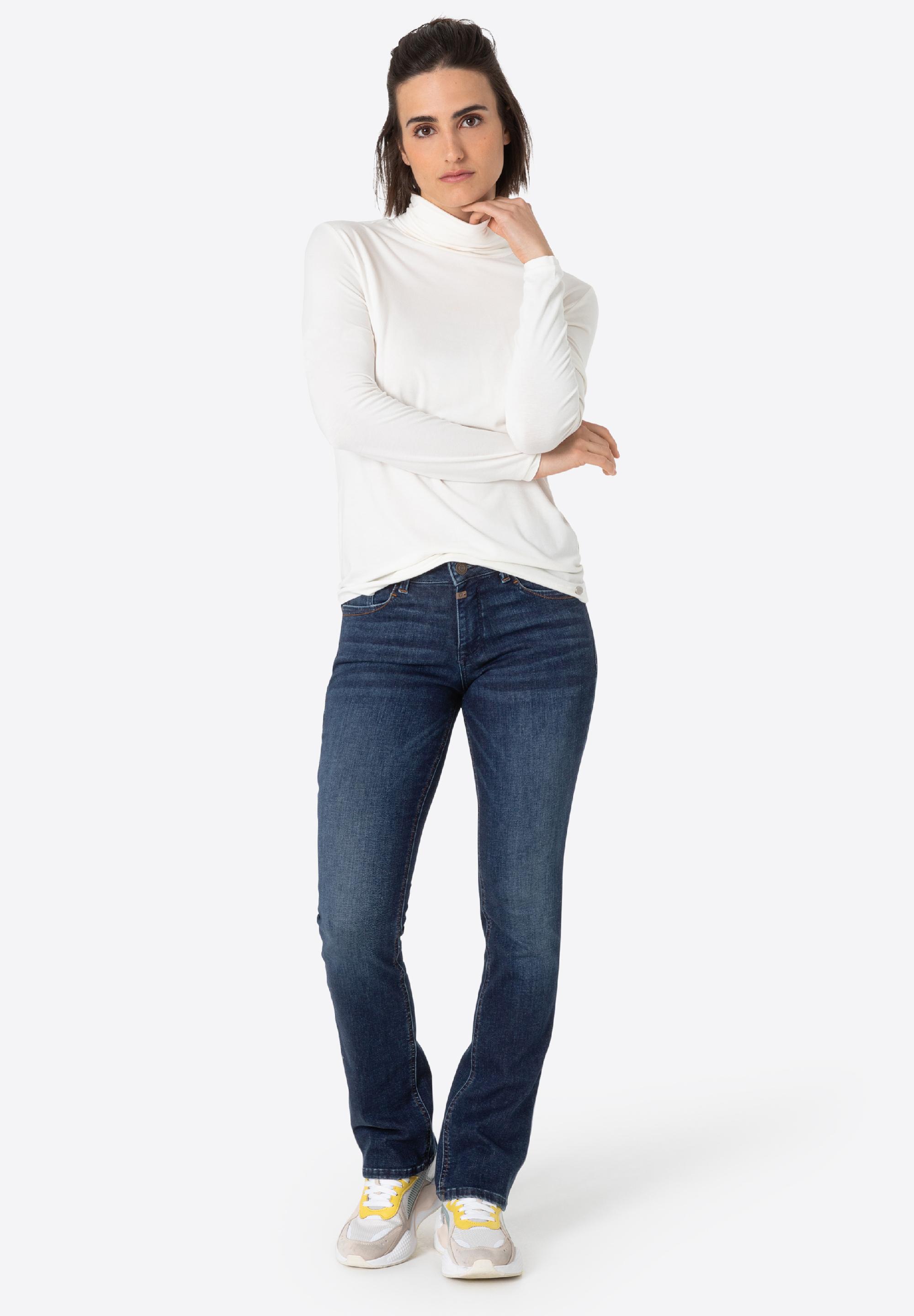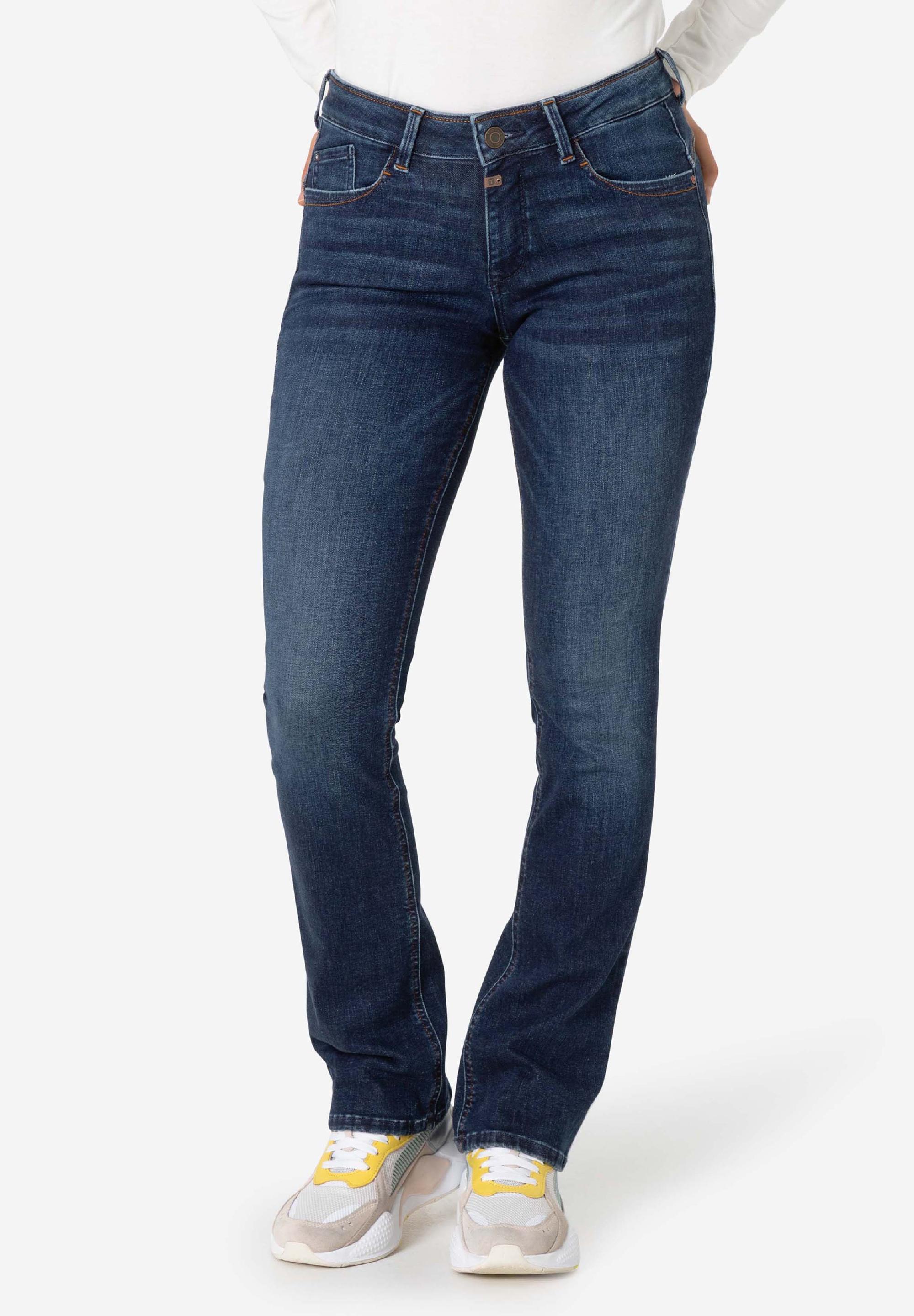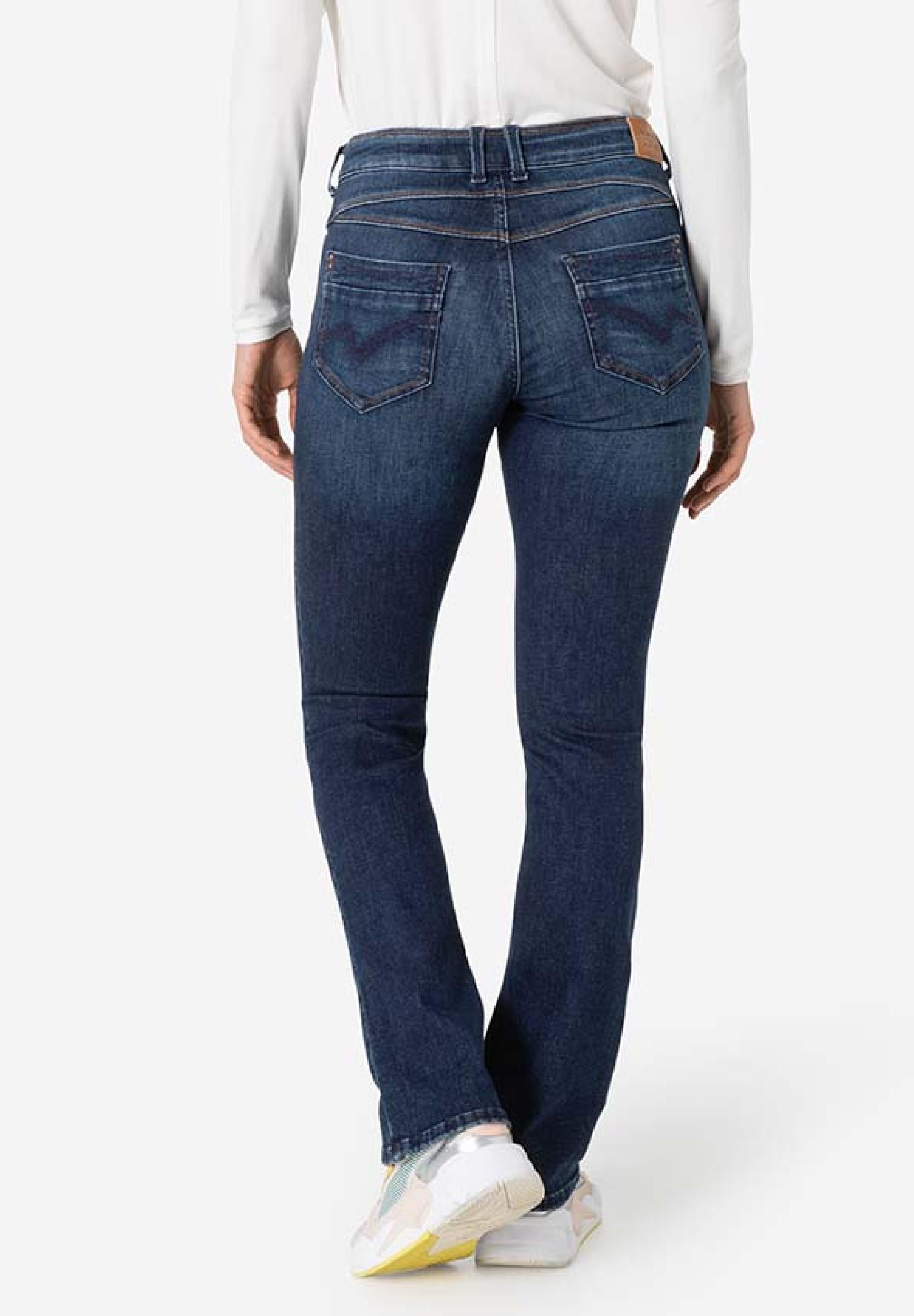 Ein lässiger Trend der 90er Jahre ist zurück: die Bootcut-Jeans. Typisch für diesen Schnitt ist der lockere Sitz über den Waden, egal wie lang das Bein ist. An Taille und Oberschenkel ist die Passform feminin, figurfreundlich und streckt optisch das Bein! Das Modell in dunkelblauer Optik mit Sitzfalten besteht aus einem elastischen Baumwoll-Elasthan-Gemisch. Das Superstretch-Gewebe sorgt für absolute Bewegungsfreiheit und hohe Formbeständigkeit. Aufwendig gestaltete Taschen- und Sattel-Details.