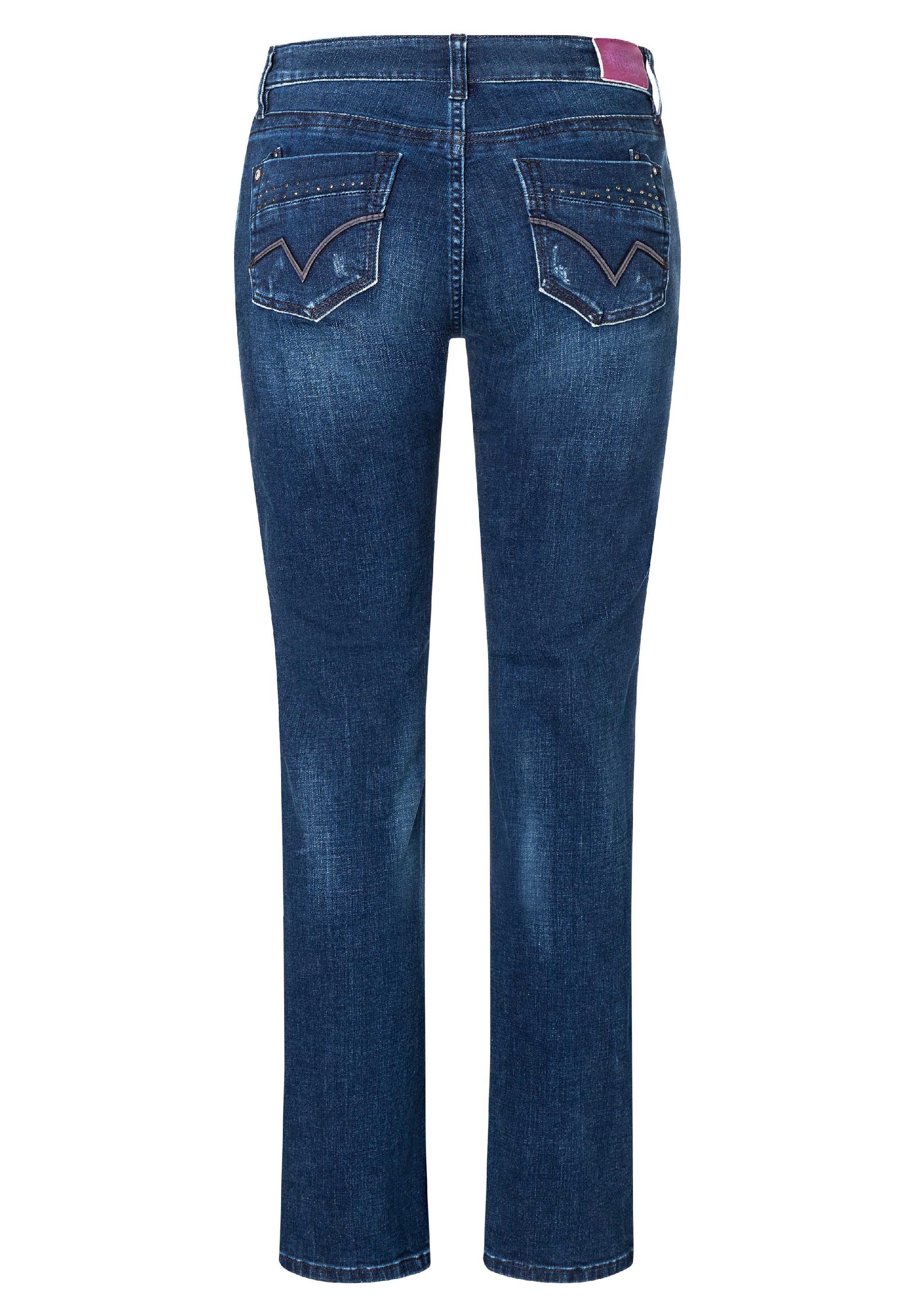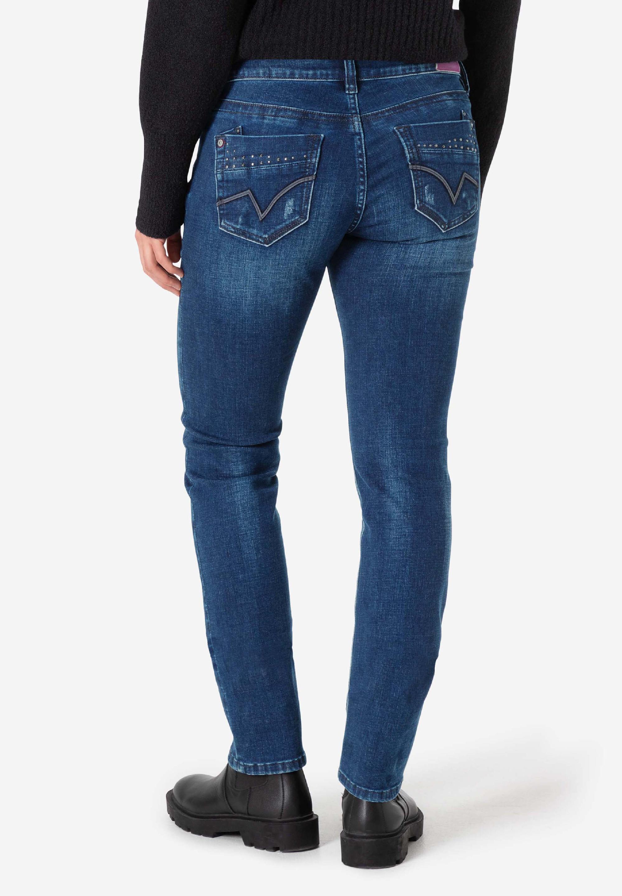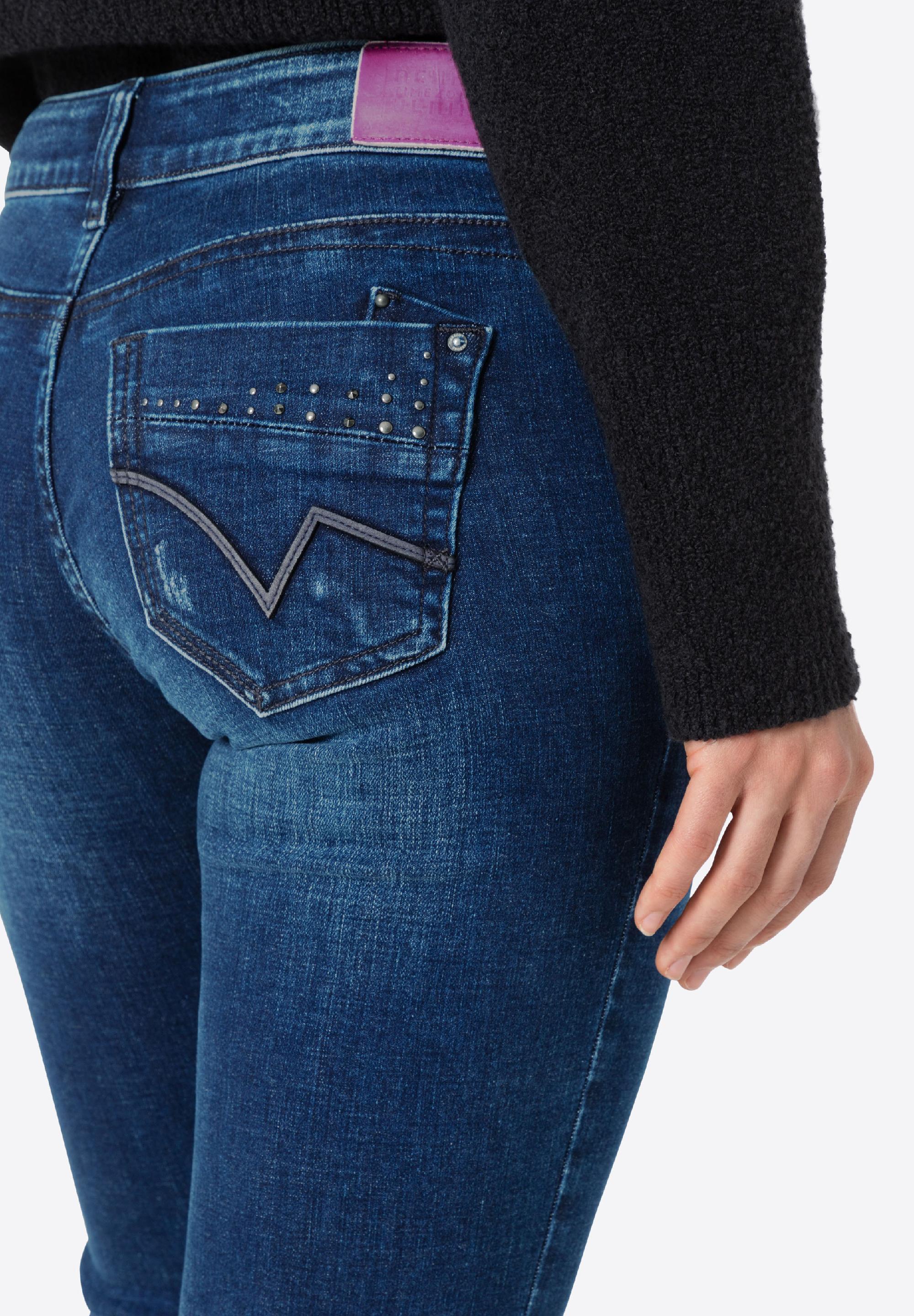Glitz and Glam! Sehr auffälliges Jeans-Design aus hochelastischem Baumwoll-Elasthan-Mix. Die gewaschene Super-Stretch-Ware mit Destroy-Details bietet absolute Bewegungsfreiheit. Der Slim Fit mit geradem Beinverlauf sorgt für eine perfekte, feminine Silhouette, der Elasthan-Anteil für Elastizität, die maßgeblich zum guten, dauerhaften Sitz beiträgt. Die aufgesetzten Gesäßtaschen machen den Po kleiner und praller. Detailreich und aufwendig gestaltet mit Taschenverzierungen aus echtem Leder.