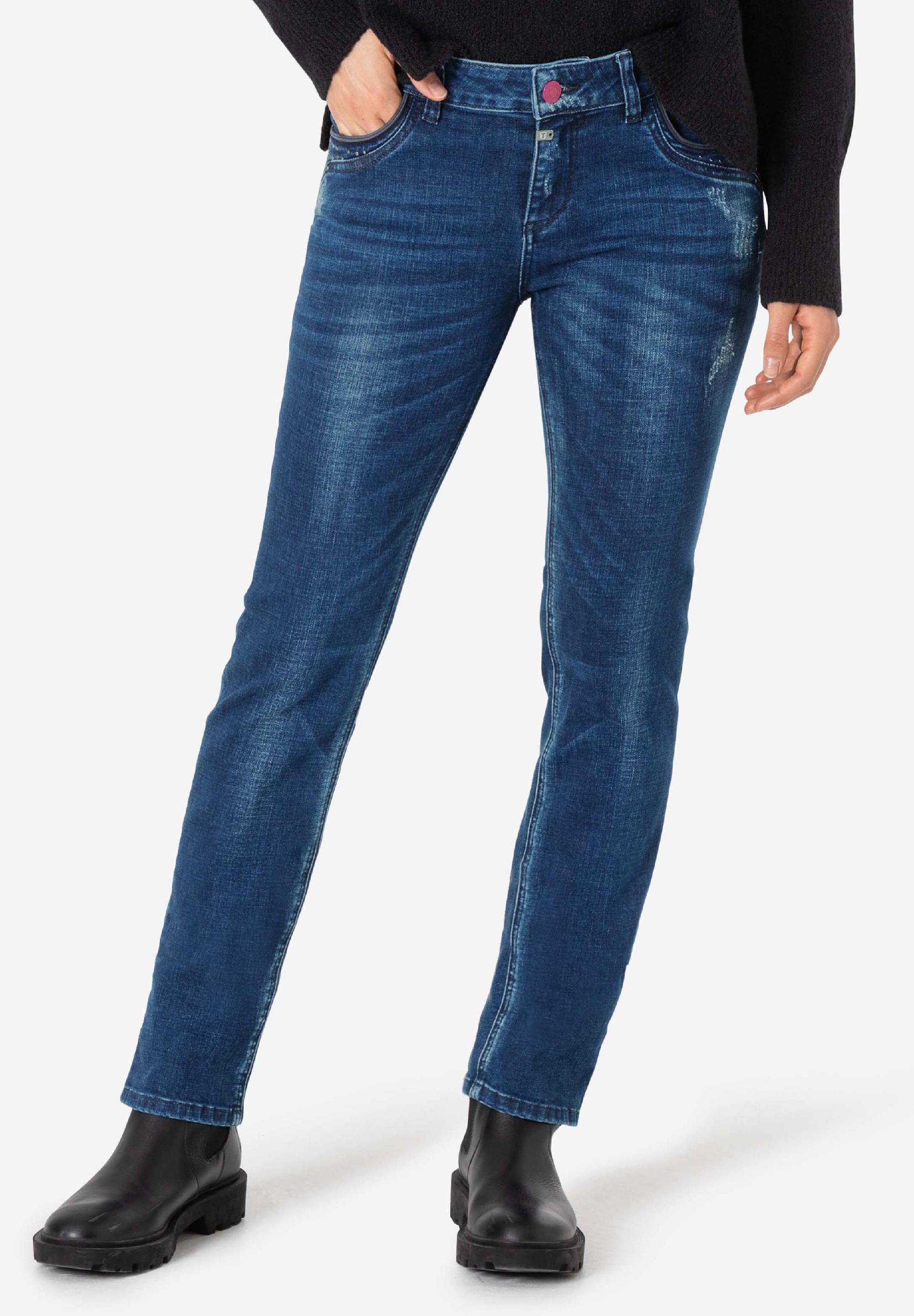 - Stark gewaschener Look mit Destroys und Sitzfalten