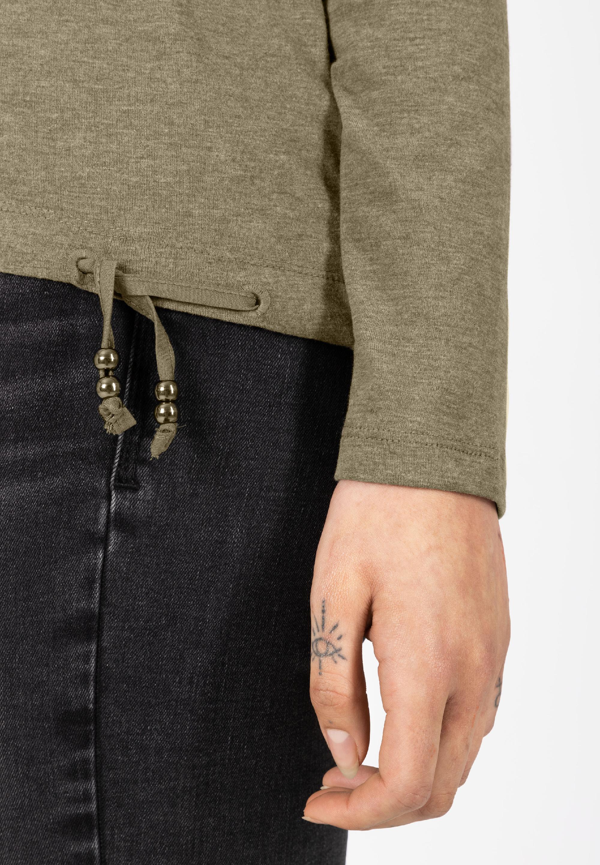 Hat eine leger-sportive Note und strahlt pure Lässigkeit aus: Das weitgeschnittene Oversize-Longsleeve aus supersoftem, gepeachtem Melange-Single-Jersey in hochwertigem Baumwolle-Mix. Das coole Piece hat eine moderne Ausschnitt-Paspel-Verarbeitung, welche sich vorne mittig bis zum Saum zieht. Die Schultern sind stark überschnitten, die Ärmel lang und schmal. Besonders: Mit dem Saum-Tunnelzug samt Bindeband und dekorativen Perlen, kann die Weite je nach Belieben variiert werden.