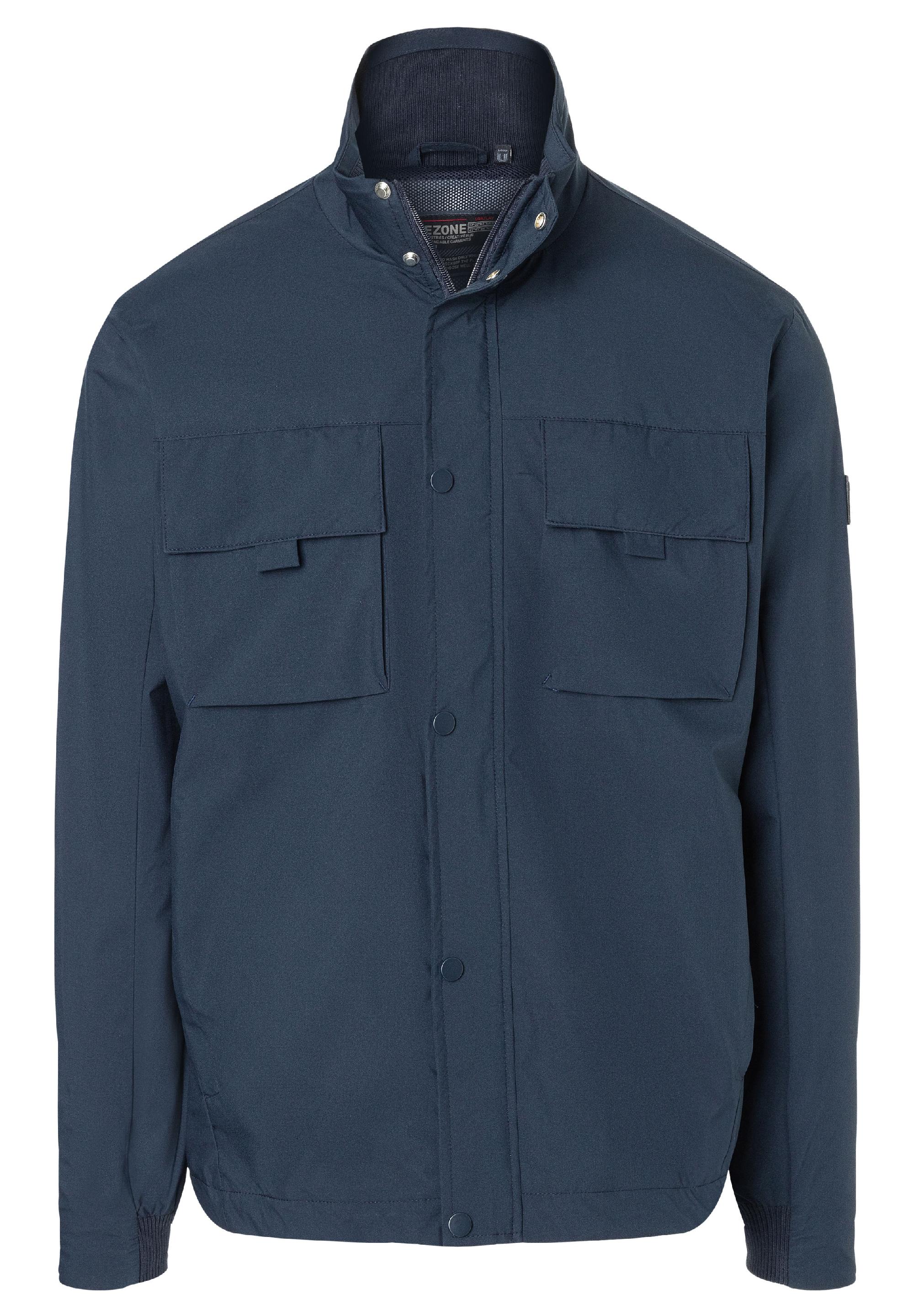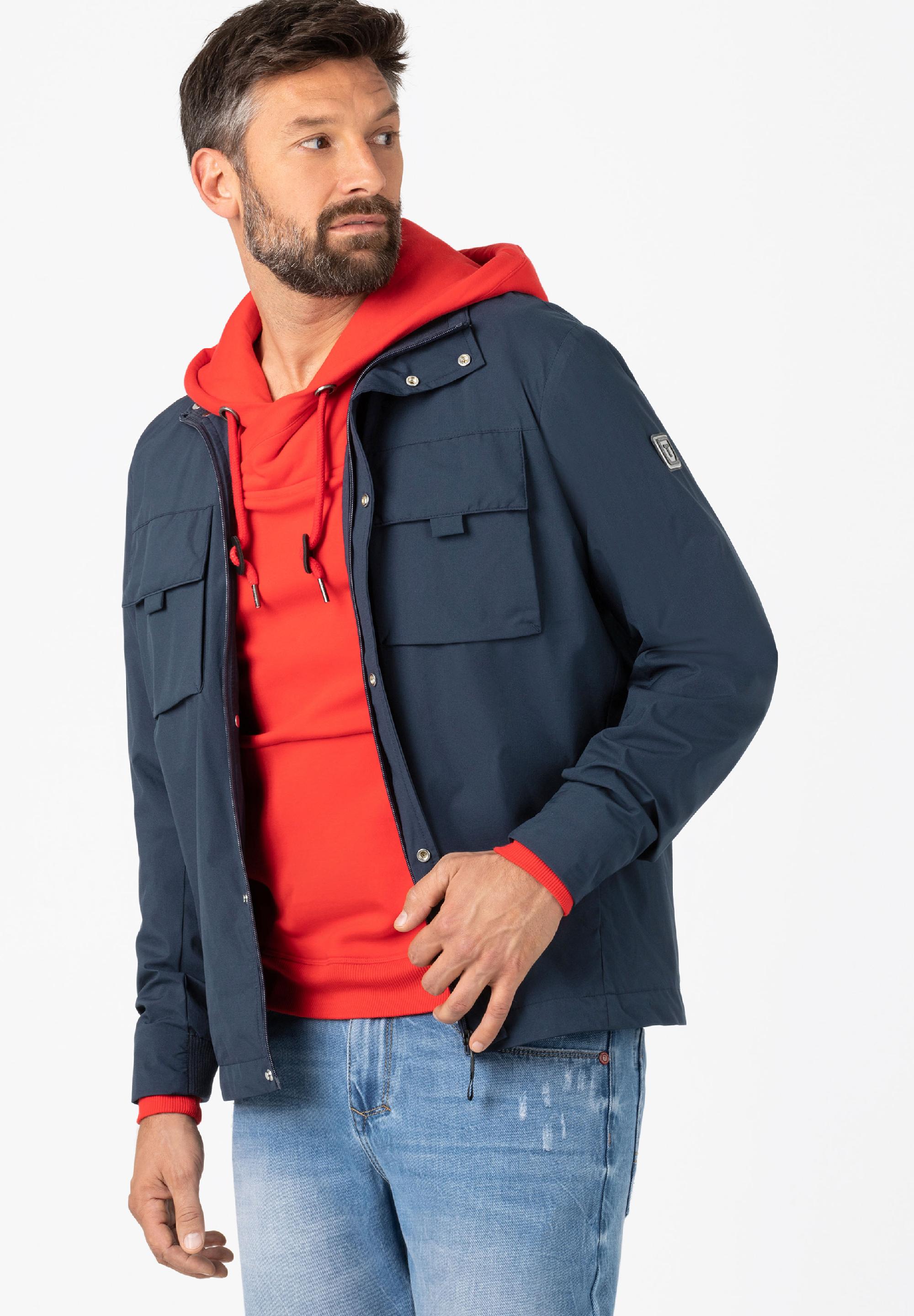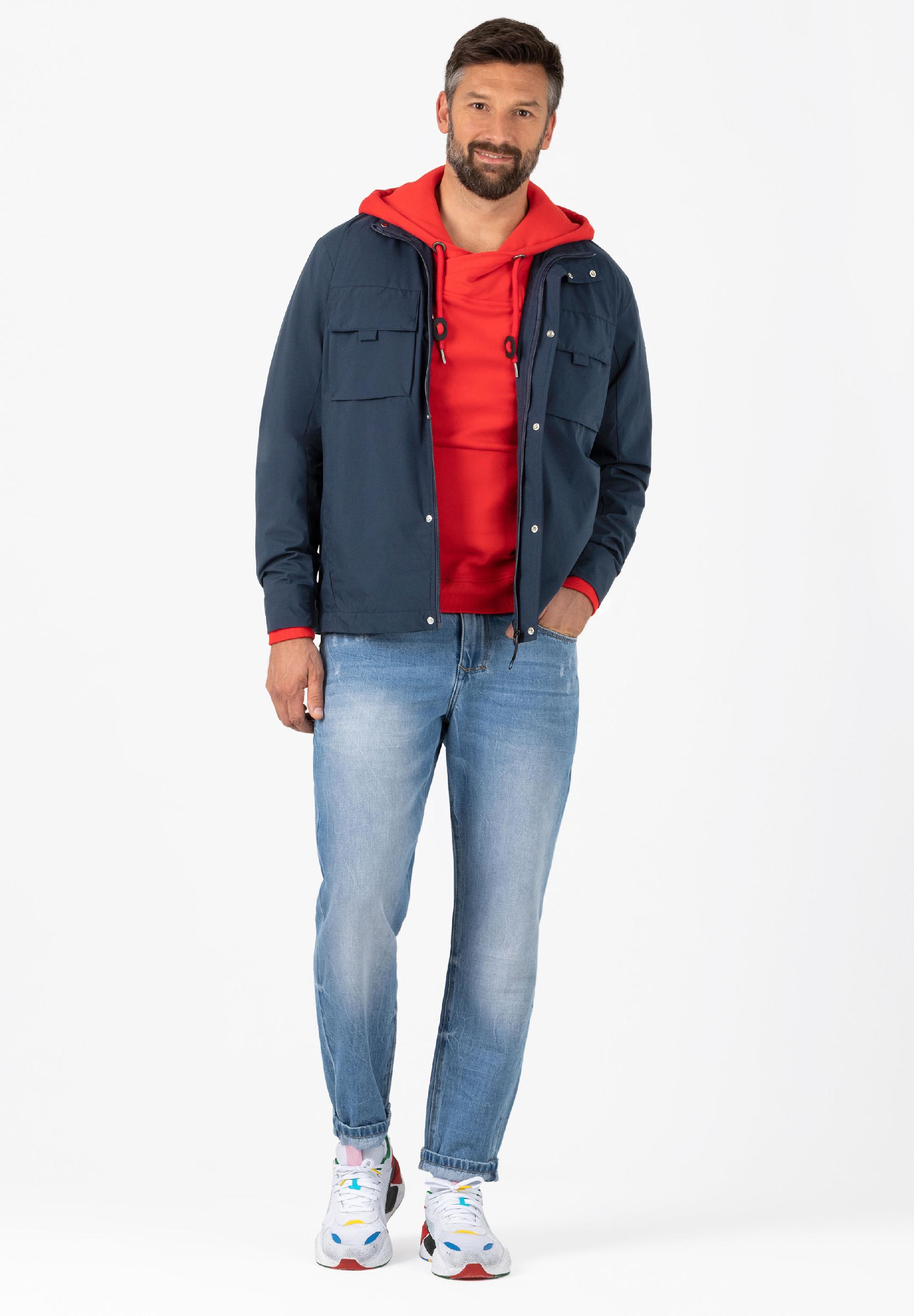 Ultraleichte Alltags-Outdoor-Jacke aus einer technischen, wasserabweisenden-Performance-Qualität. Sportives Design für hohe Ansprüche. Modell mit Stehkragen, Frontzipper mit darüberliegender Druckknopf-Leiste, Naht-Eingrifftaschen, aufgesetzten Blasebalg-Brust-Klappentaschen und verstellbarem Tunnelzug am Saum. Mit soften Rippstrick-Details am Kragen und am Ärmelsaum. Innen: Netzfutter, Rucksackgurte, zwei Zipper-Taschen und ein Stoffbeutel zum Verstauen der Jacke.