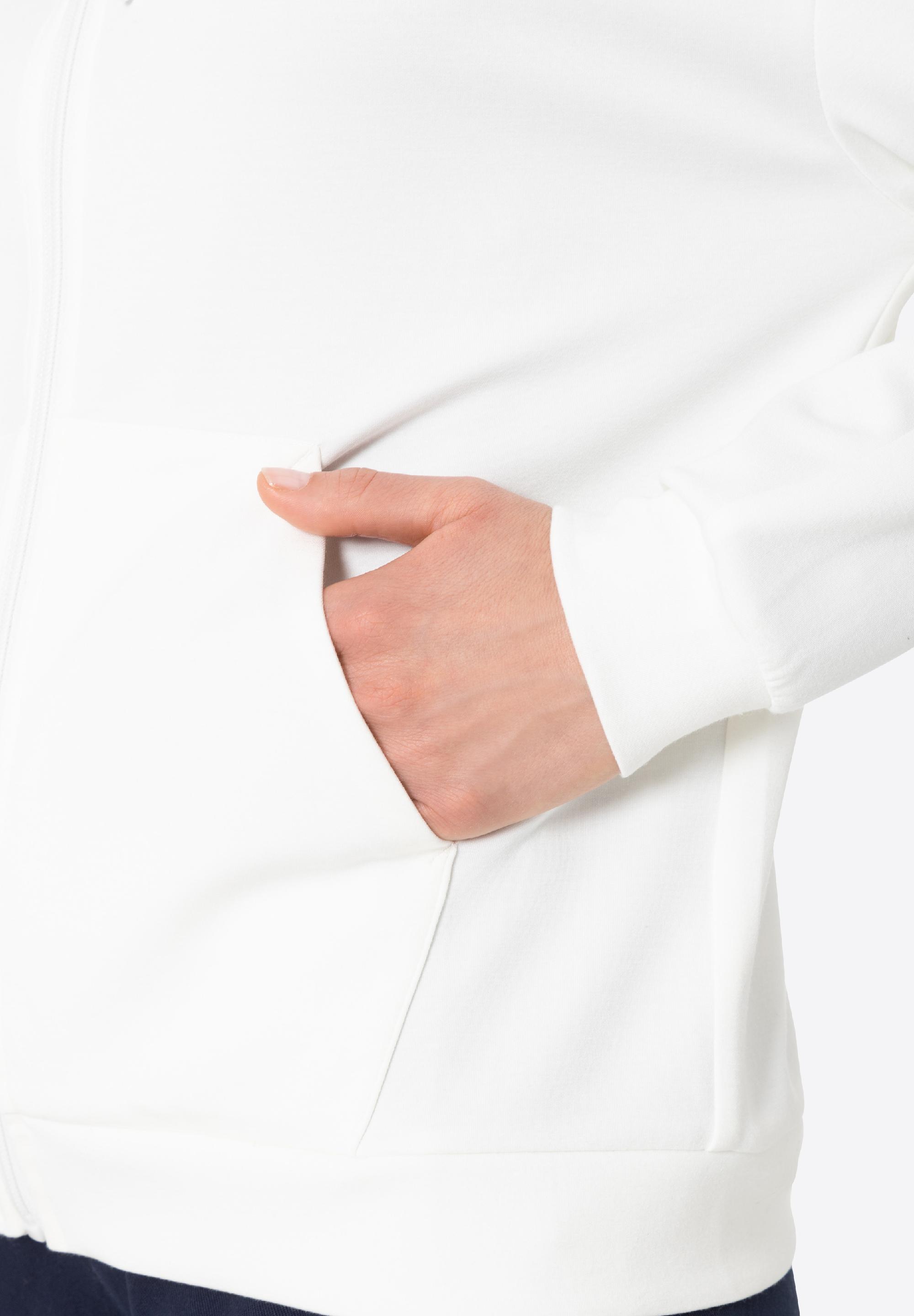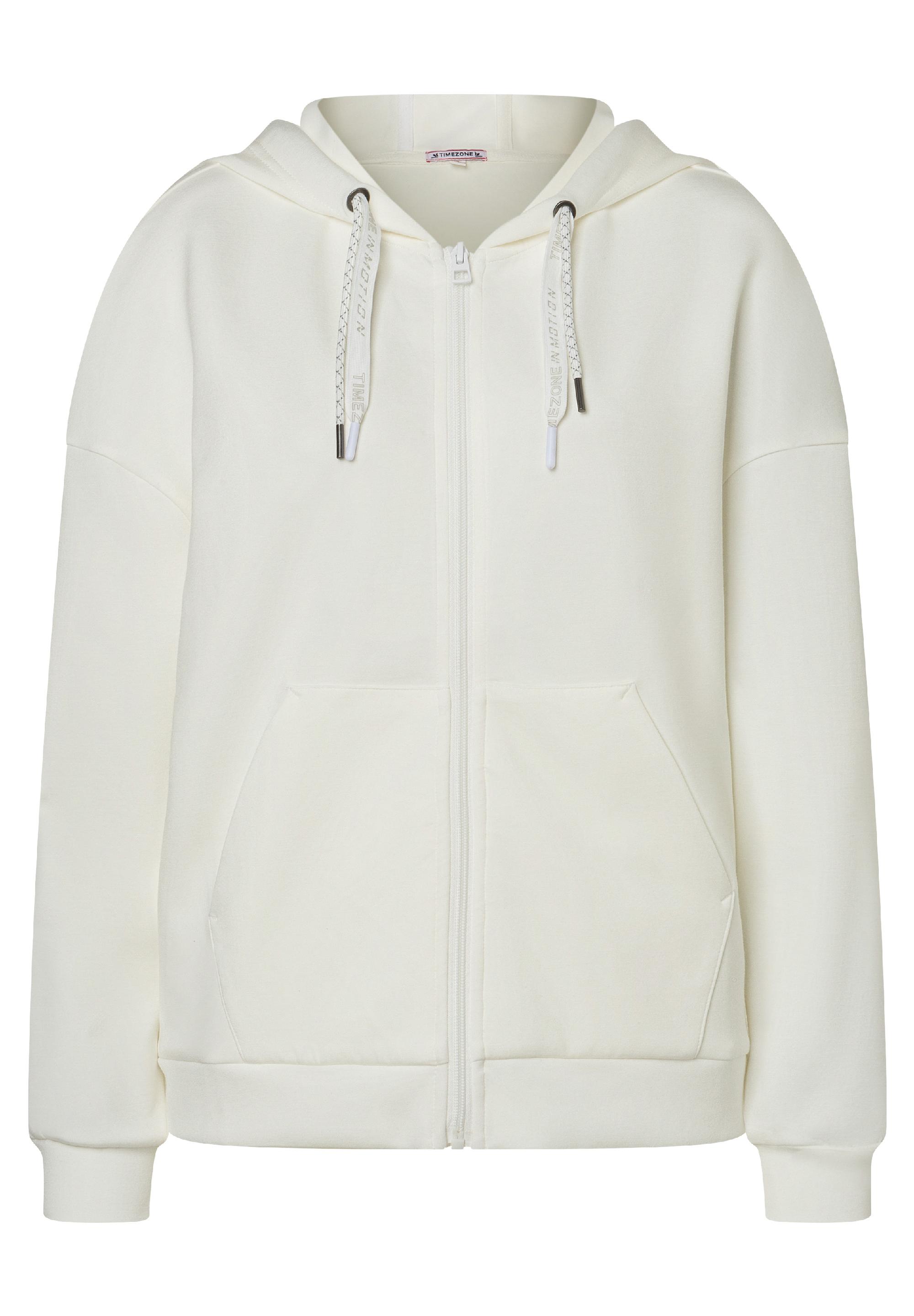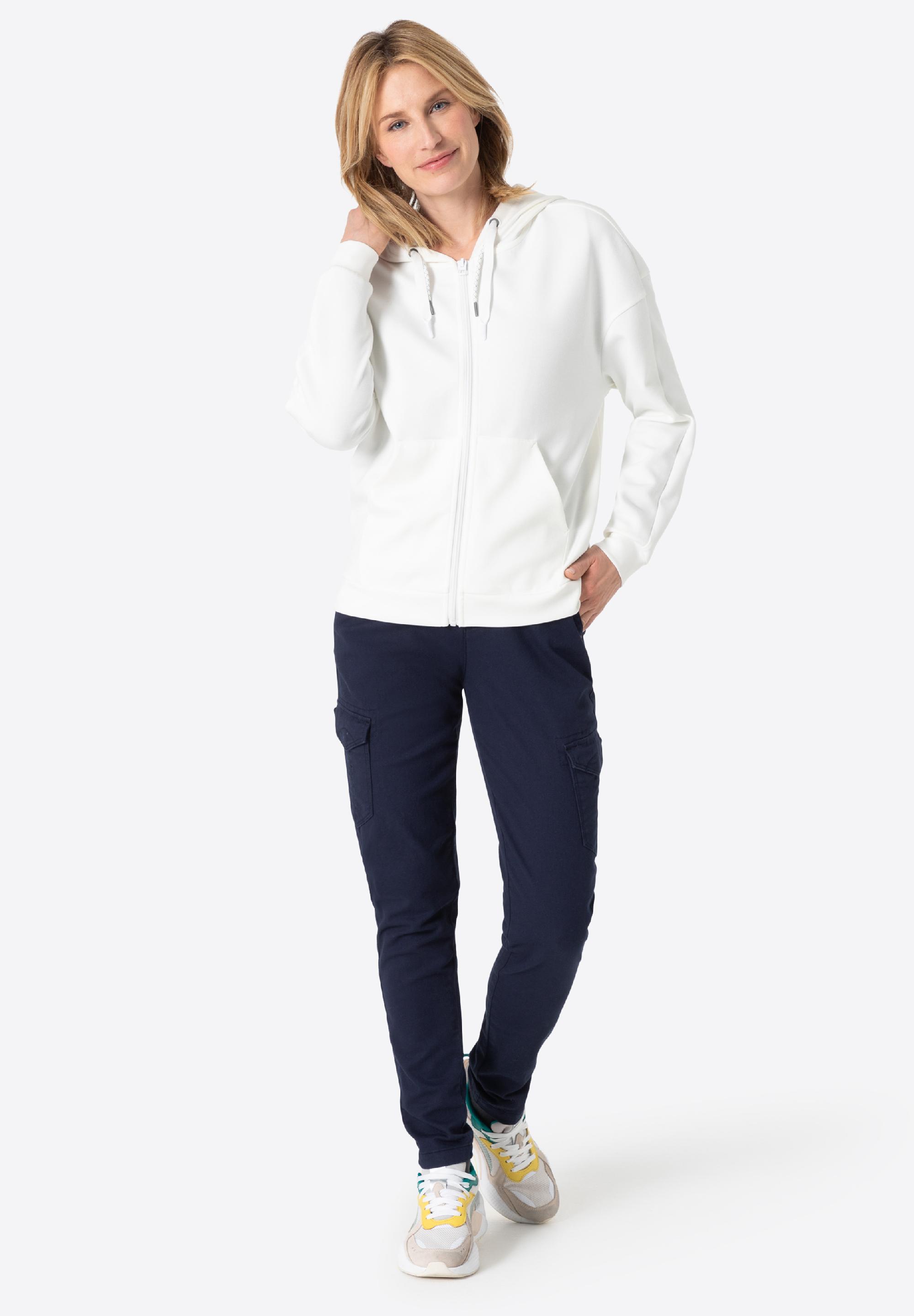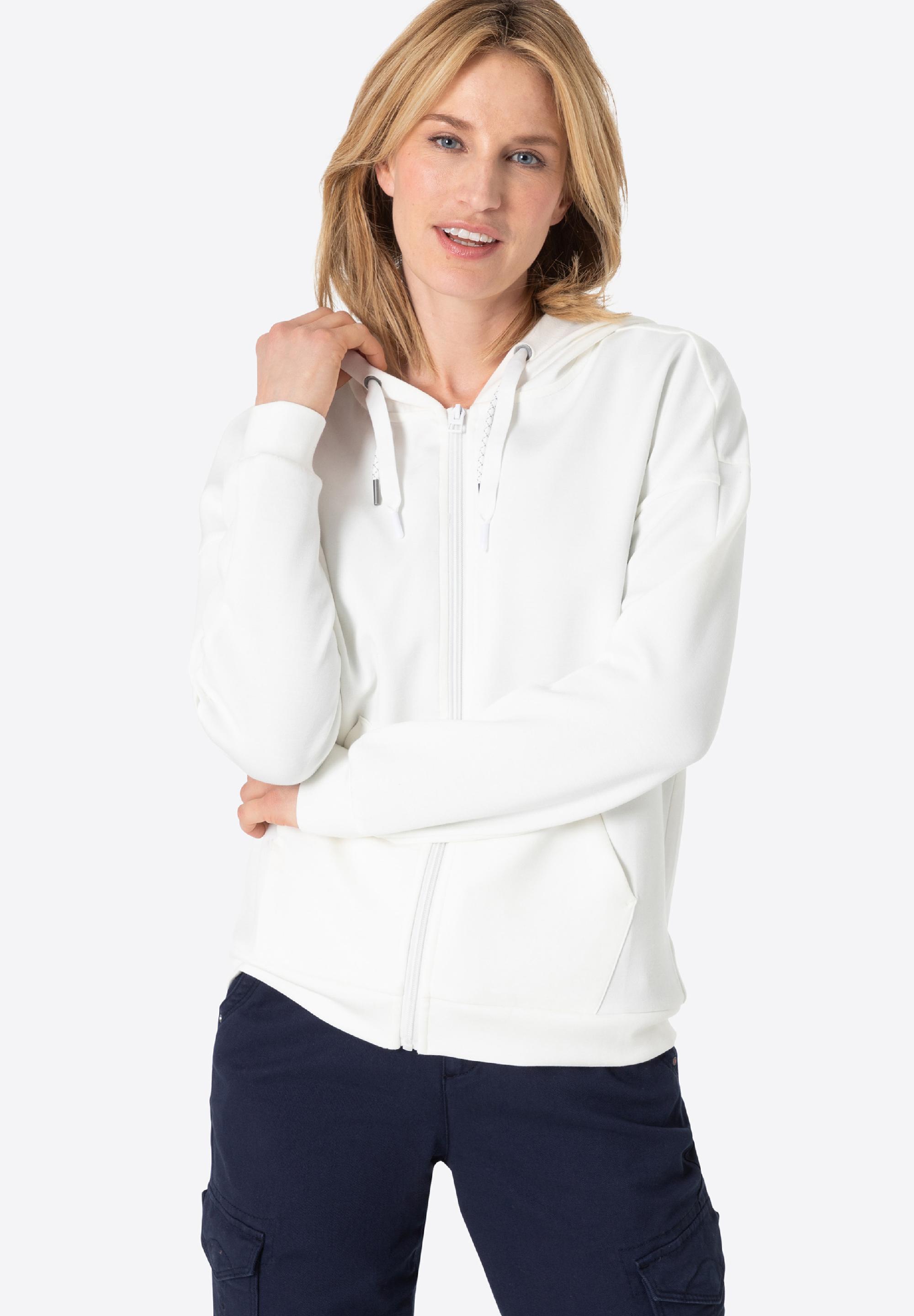 Der sportive Allrounder, die Hoodie-Jacke, überzeugt durch ihr schickes Design. Das Modell verfügt über moderne, cleane Details und eine unglaublich softe, stretchige Scuba-Interlock-Qualität aus Modal-Mix. Die Features: Kapuze, überschnittene Schultern mit versetzten Ärmelnähten, durchgehender Front-Zipper, aufgesetzte Kängurutasche und angesetzte Bündchen an Ärmeln und Saum. Cool: Statt nur einer Kordel im Kapuzenrand hat dieser Hoodie gleich zwei. Eine flache und eine runde.