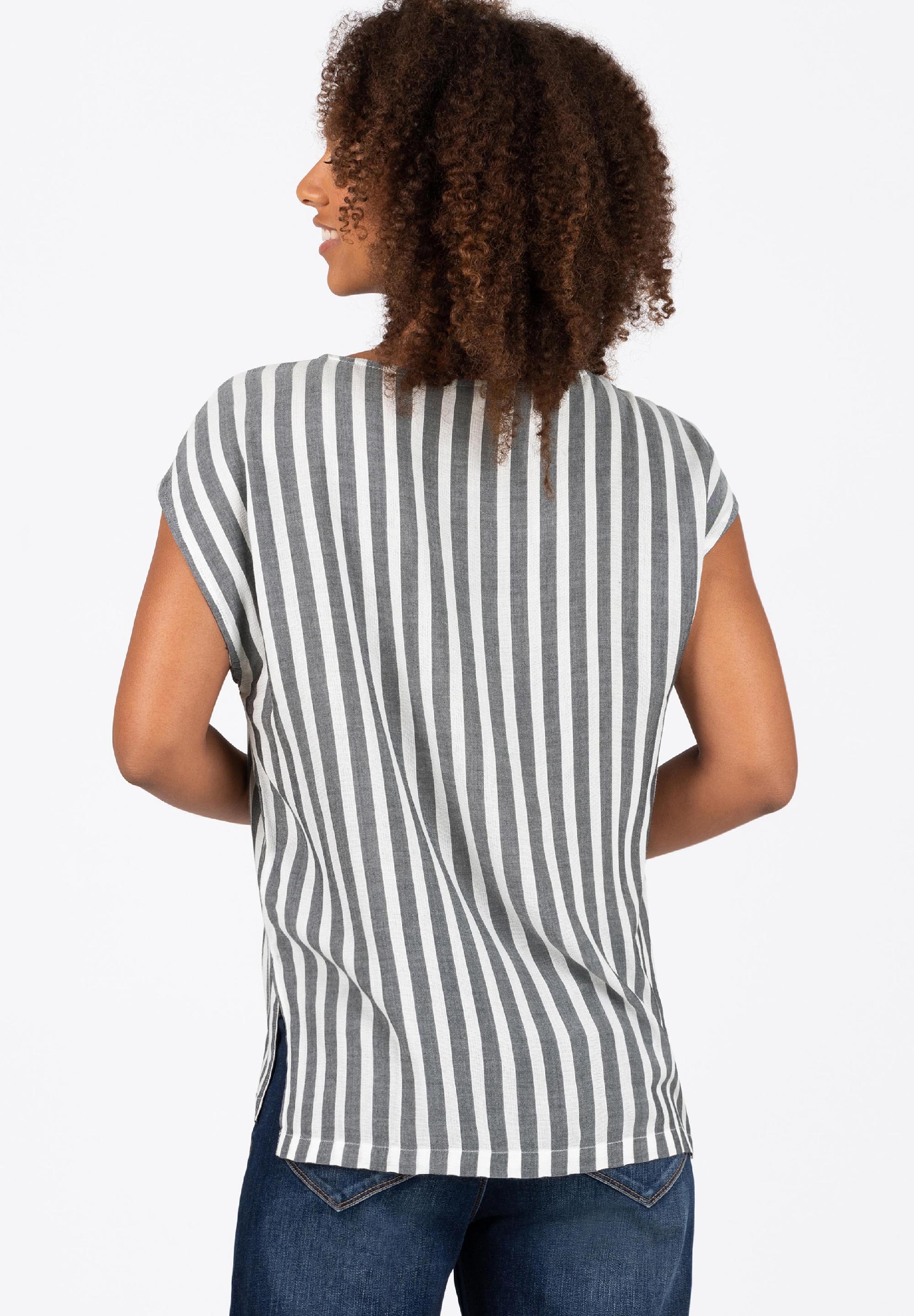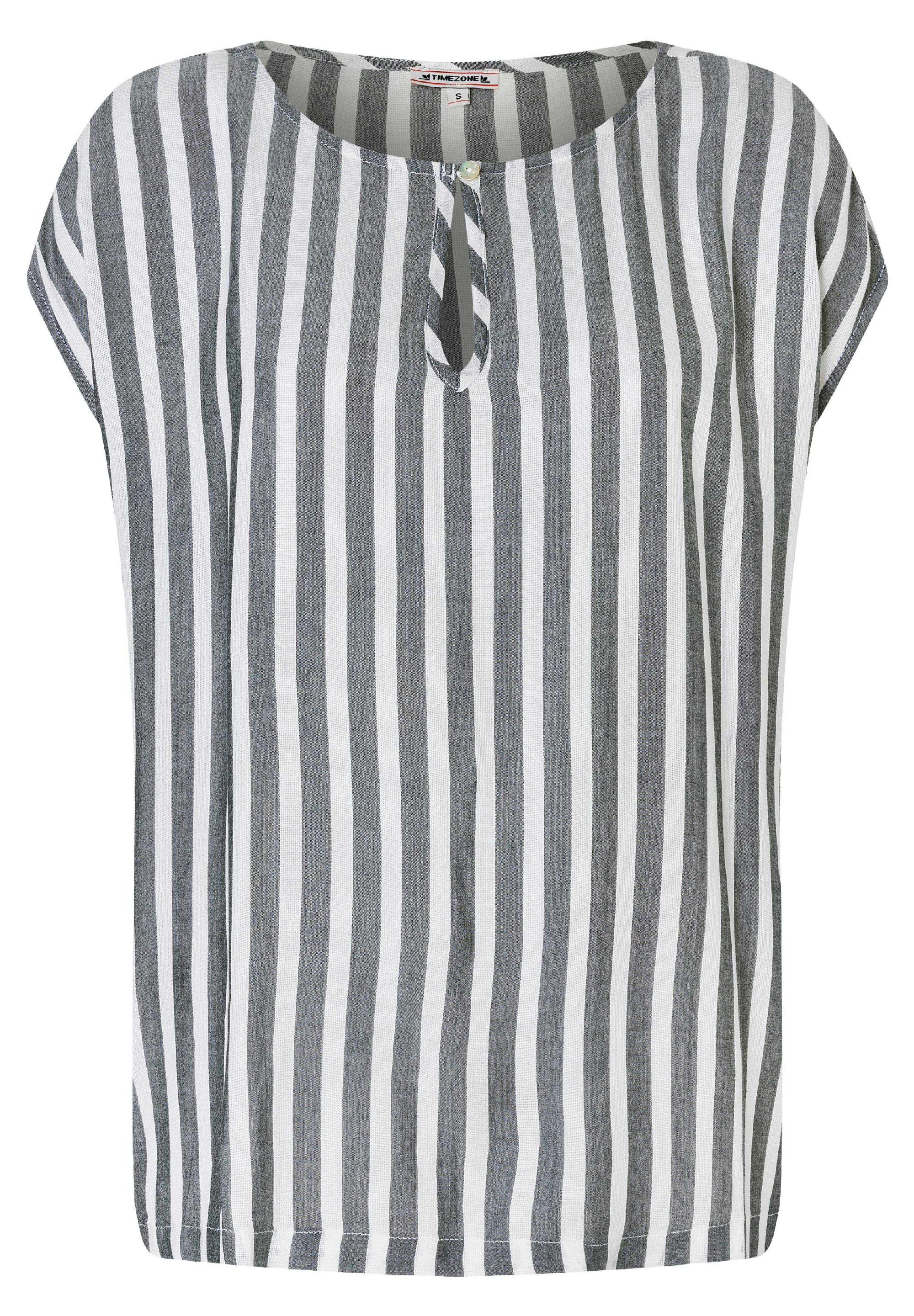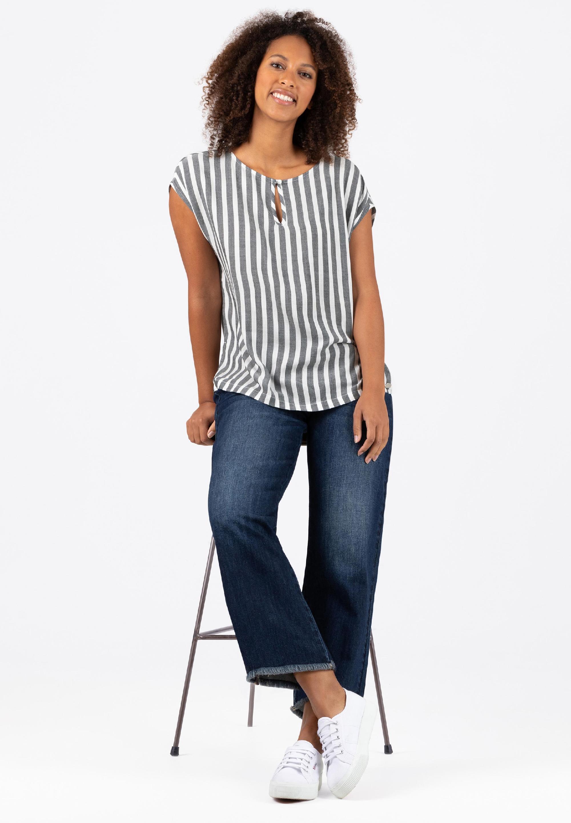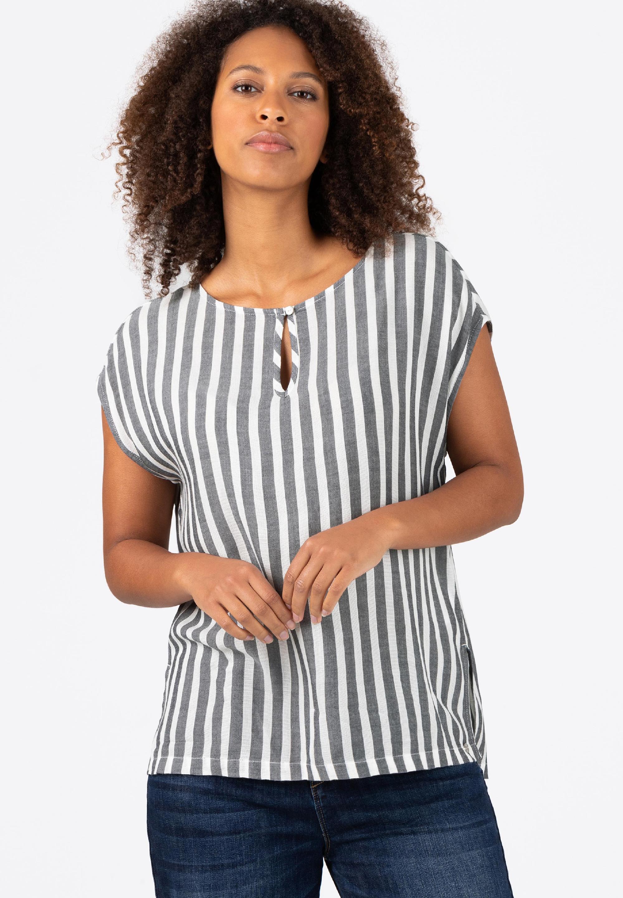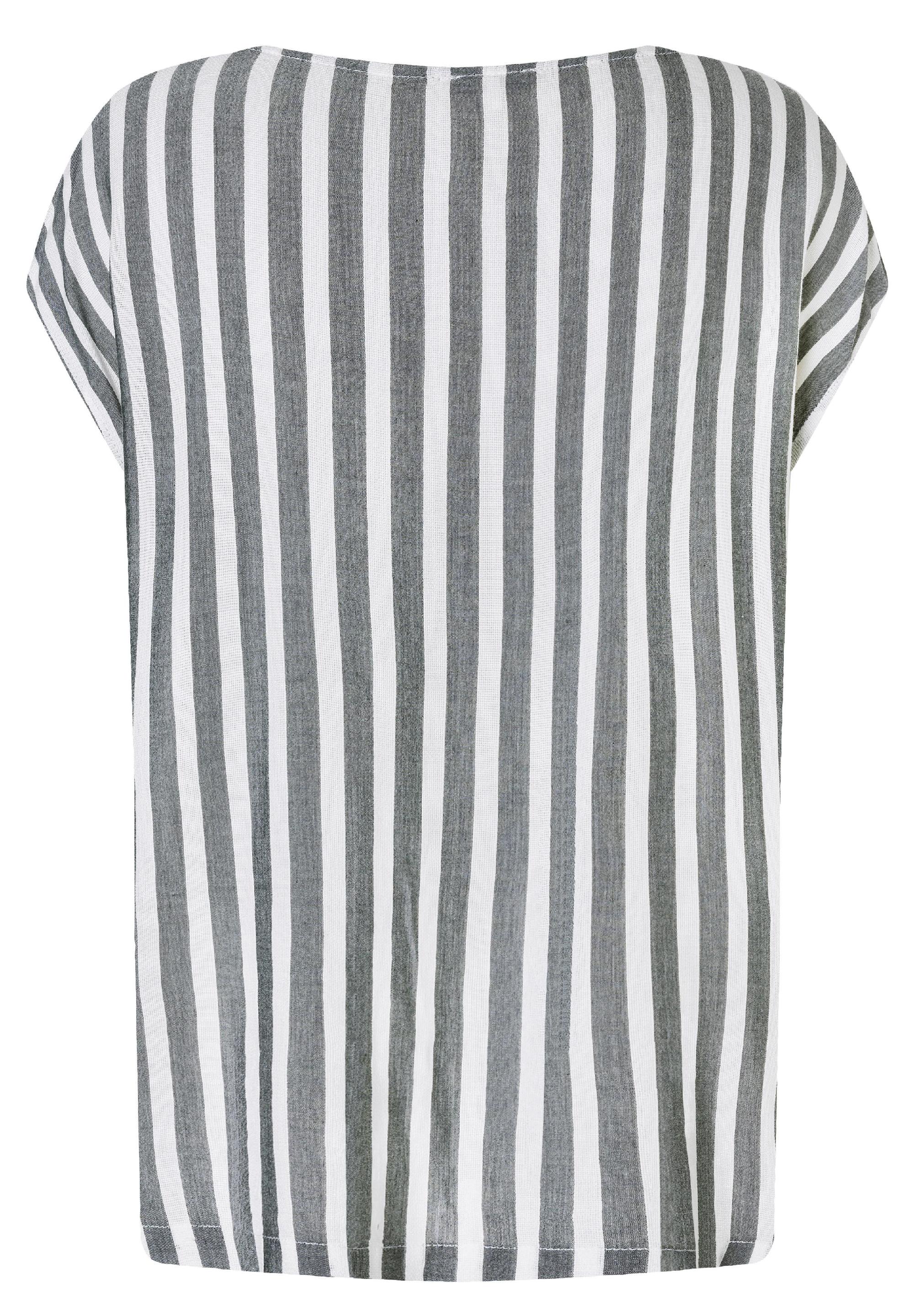 Sind nicht mehr aus der Fashion-Welt wegzudenken: locker geschnittene und clean designte Streifen-Blusen-Shirts. Sie passen hervorragend zu Denim-Teilen. Egal ob rockig zu Jeans-Shorts und Lederjacke oder edel zur dunklen Skinny Jeans. Das Modell hat einen lockeren, geraden Schnitt mit überschnittenen Schultern, einen knöpfbaren Rundhalsausschnitt mit Cut-Out-Detail, ein leicht verlängerten Rücken und lässige, hohe Seitennaht-Schlitze.