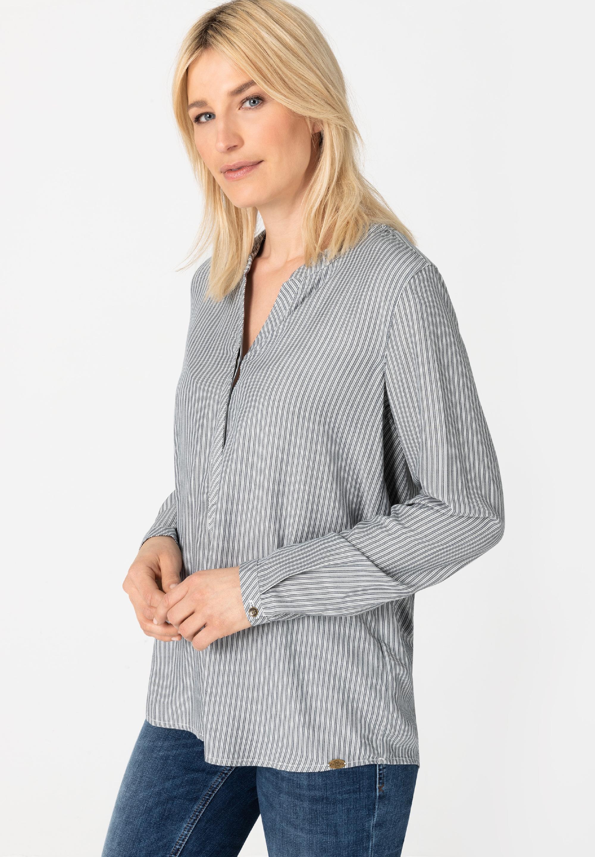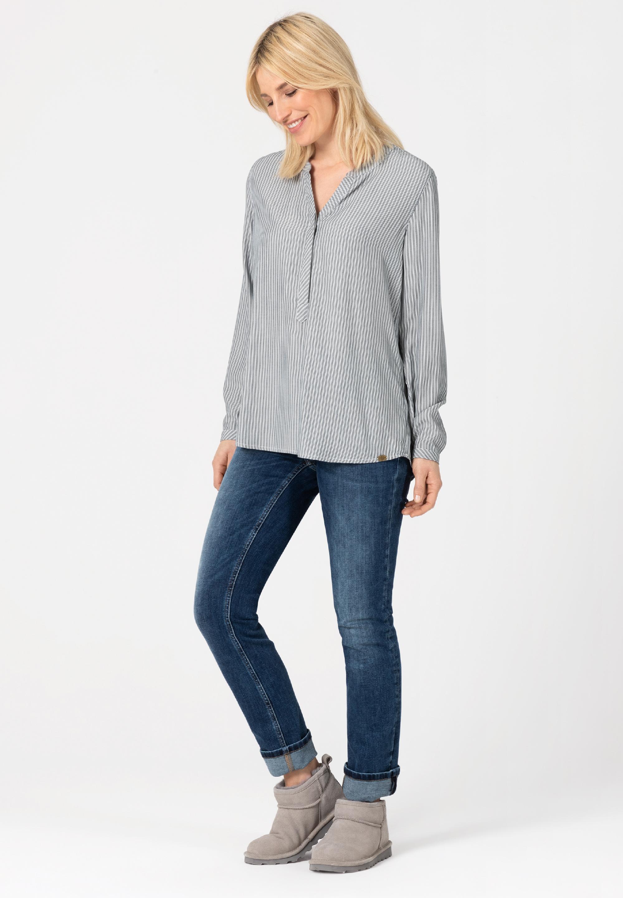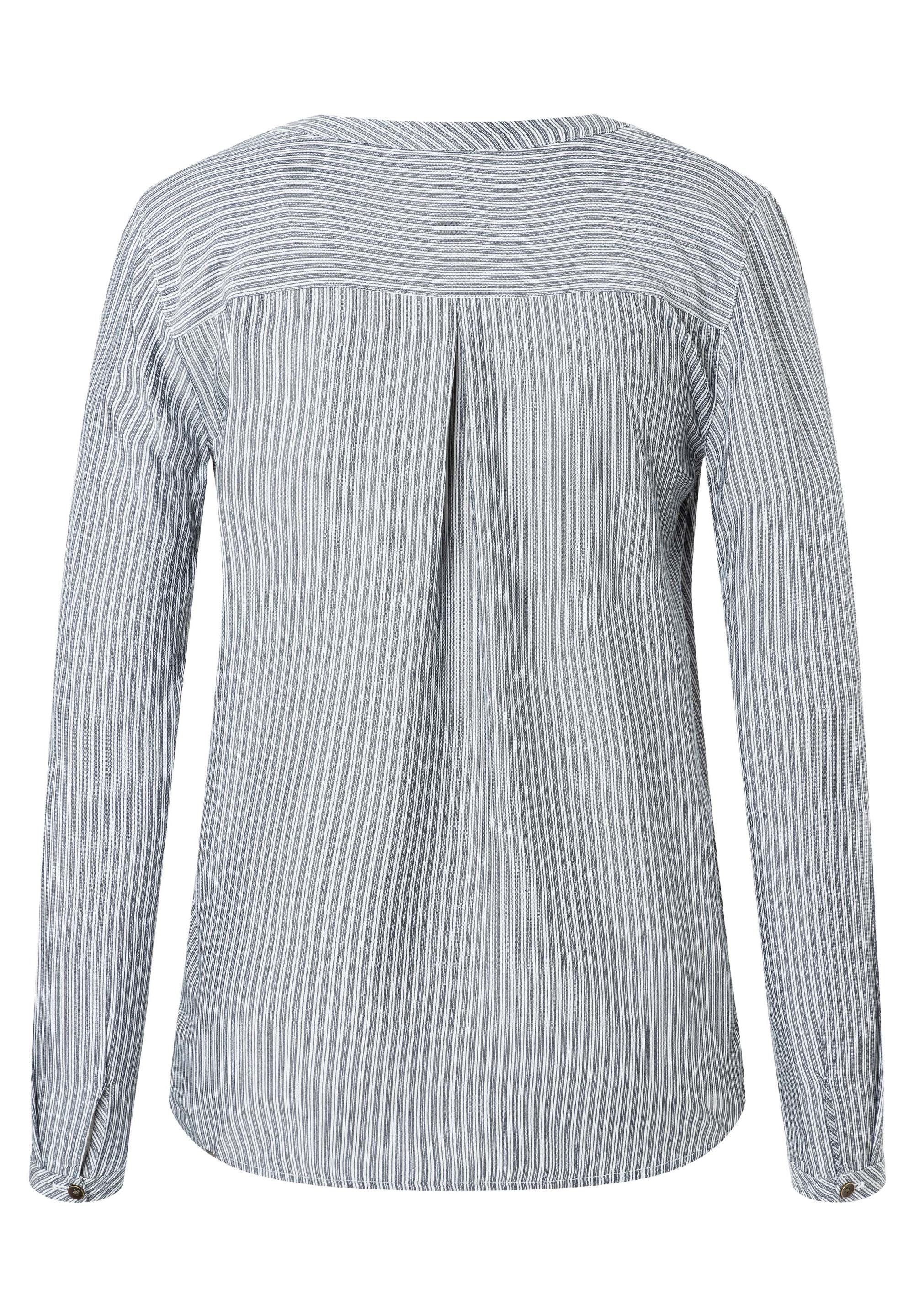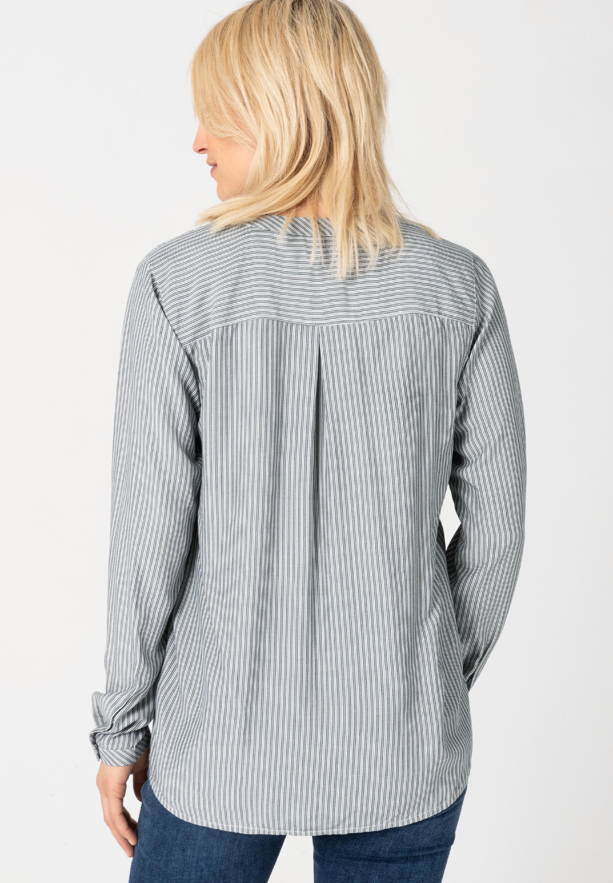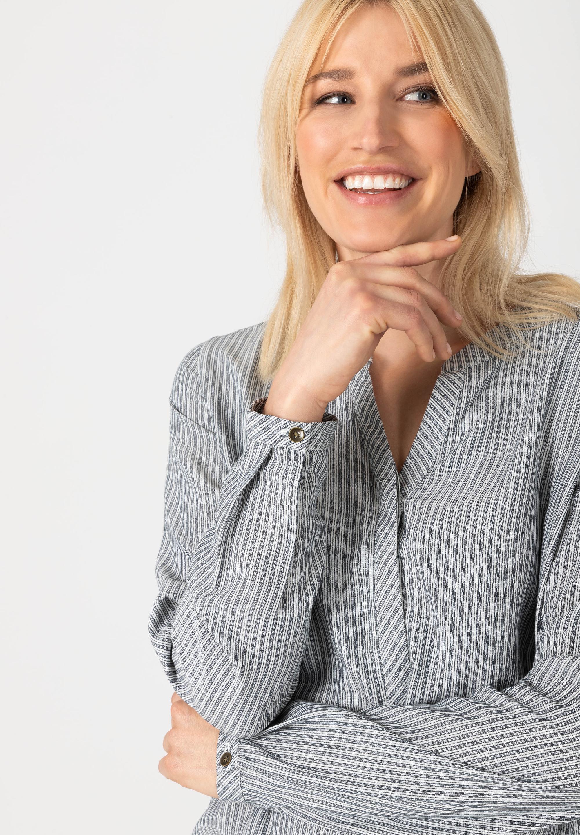 Sind absolute Klassiker und bieten gleichzeitig eine Unmenge an Styling-Ideen: Blusen. Dieses sportiv-lässige Modell kann verspielt-feminin oder rockig-cool kombiniert werden. Die Langarm-Bluse ist aus reiner, fließender Viskose-Qualität gefertigt und hat ein feines, garngefärbtes Streifen-Dessin. Mit Stehkragen, V-Ausschnitt, halber, verdeckter Knopfleiste, schmaler Ärmel-Manschette und leger gerundeter Saumlinie. Verlängerte Rückseite mit Passen-Verarbeitung und Kellerfalte.