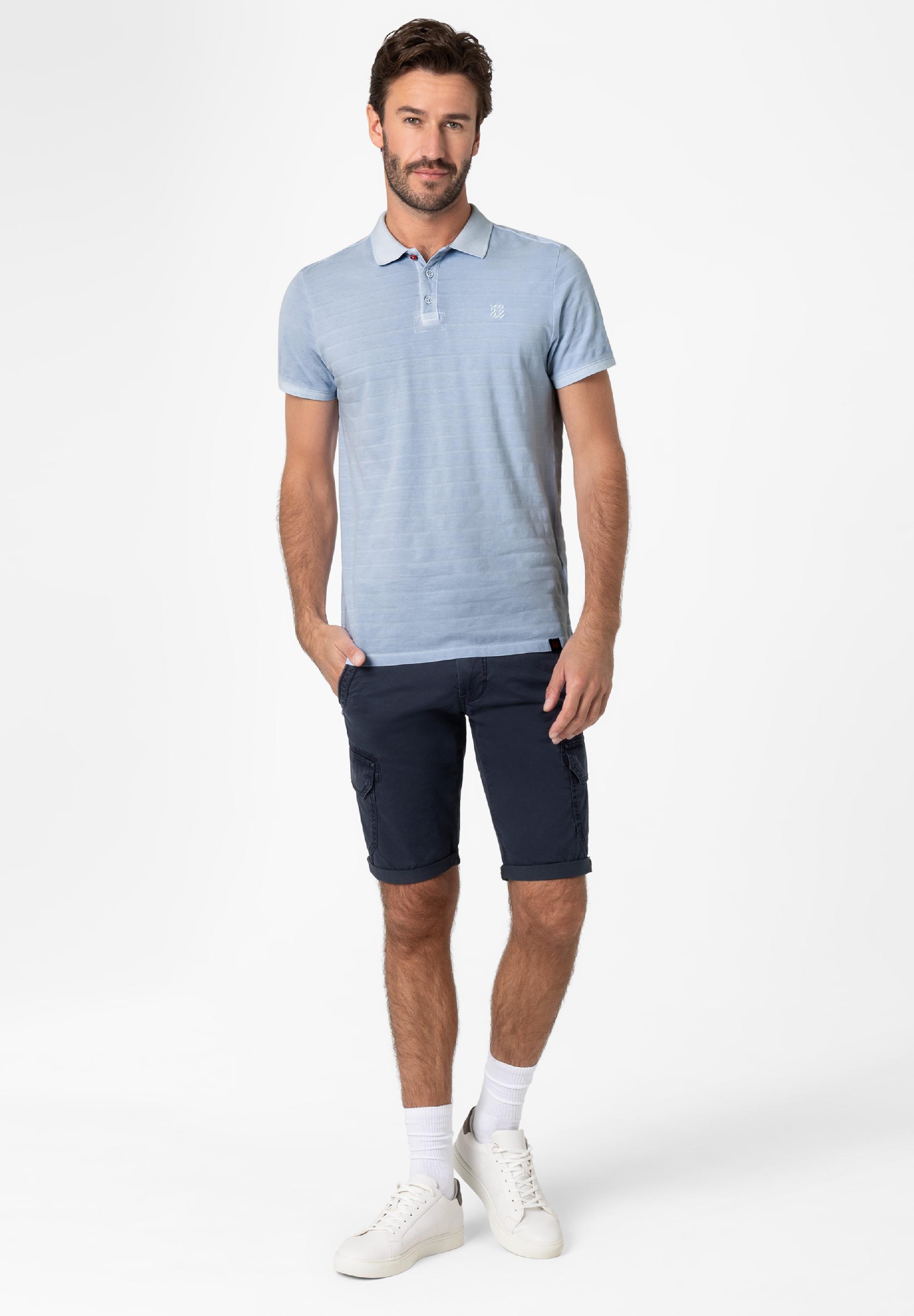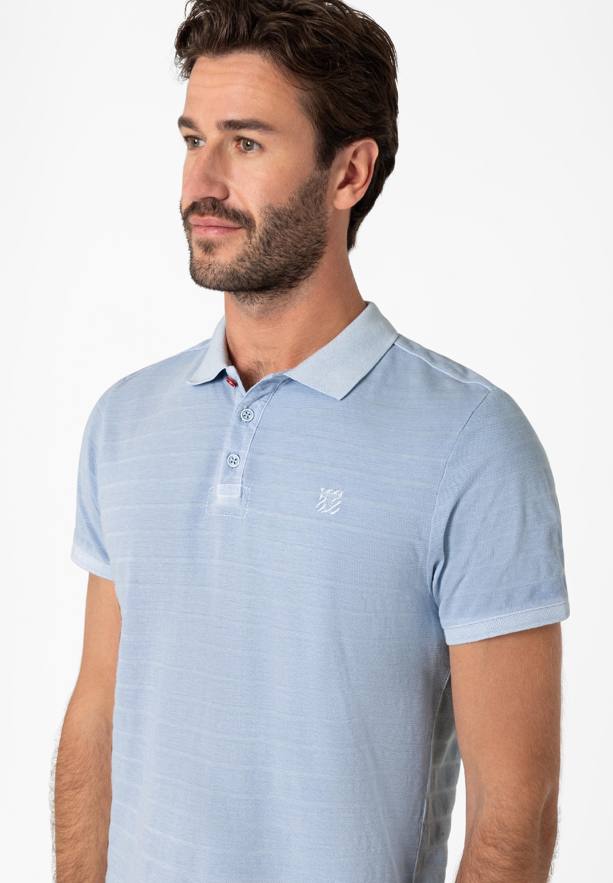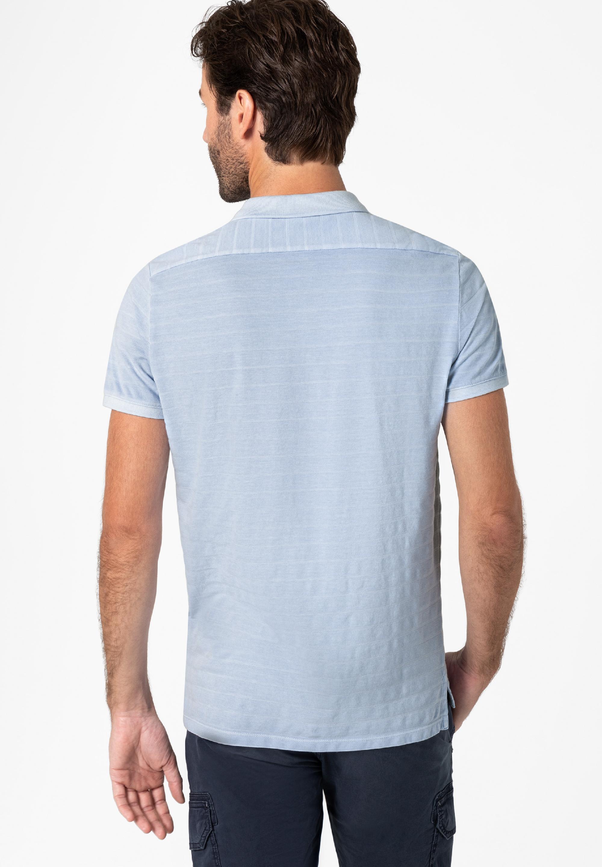 Das Kurzarm-Poloshirt ist eine Mischung aus Polohemd und T-Shirt und kommt mit dem charakteristischem Flachstrickkragen. Der Fokus liegt hier eindeutig auf dem Material. Der interessante Jacquard-Piqué-Jersey hat ein aufwendiges, tonales Streifenmuster und eine lässige Farb-Waschung mit Garment-dye-Effekt. Modell mit kurzer, schmaler Knopfleiste, farblich abgestimmter Logo-Stickerei auf der Brust, schmaler Schulterpasse, leger geschlitzten Seitennähten und dezent verlängertem Rückenteil.